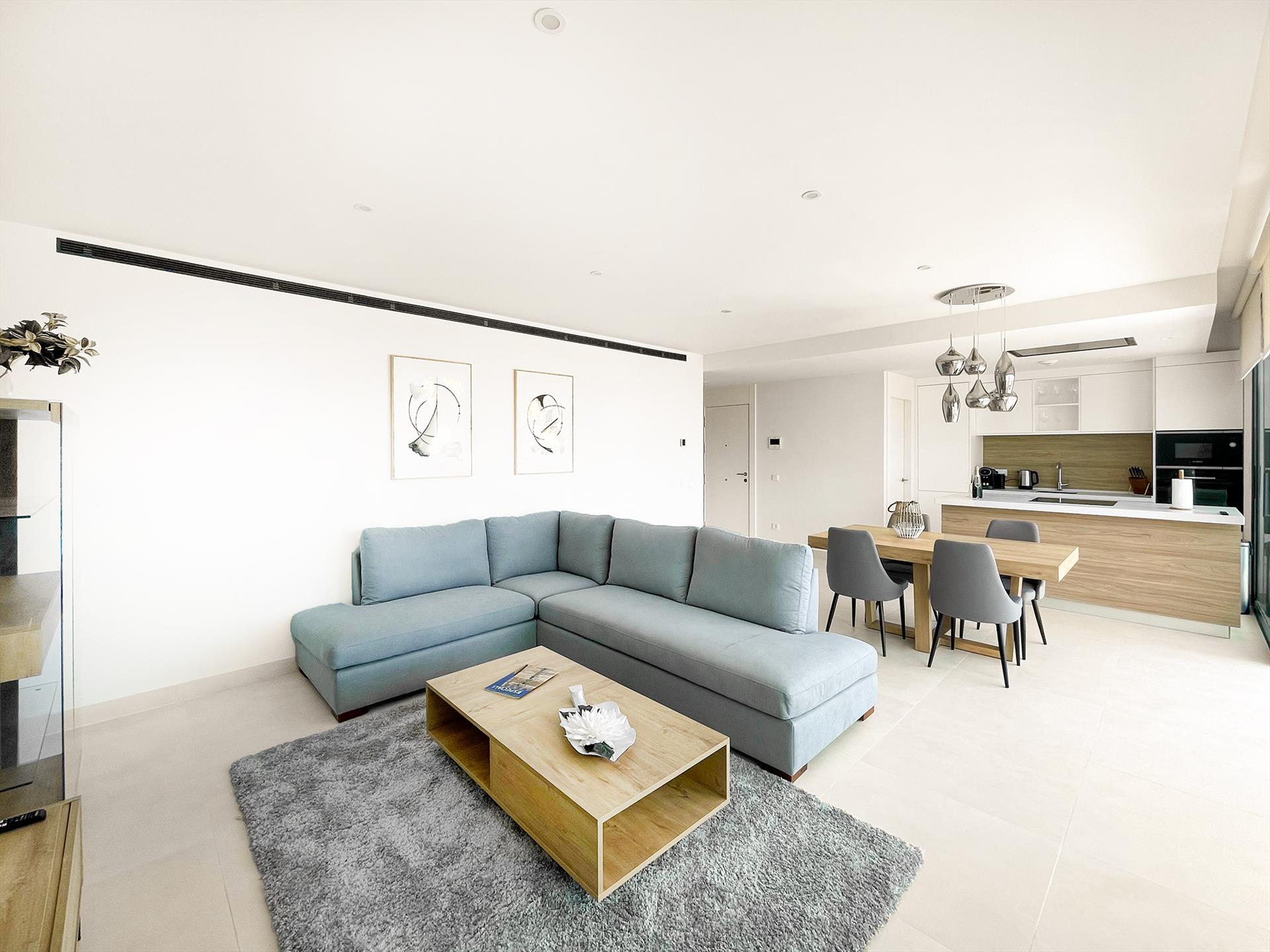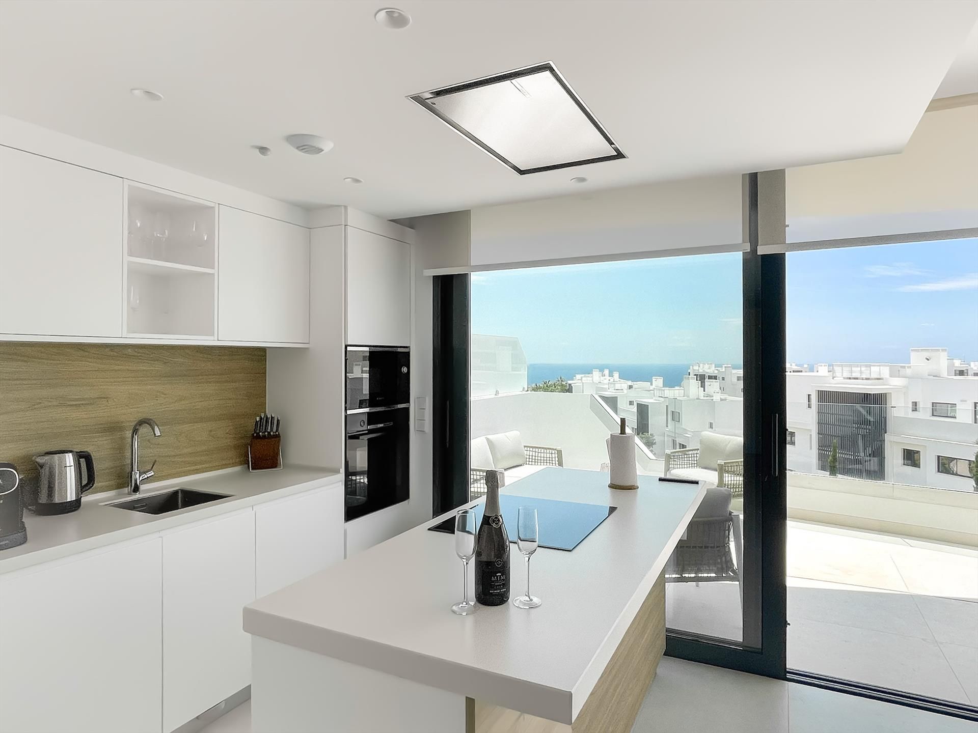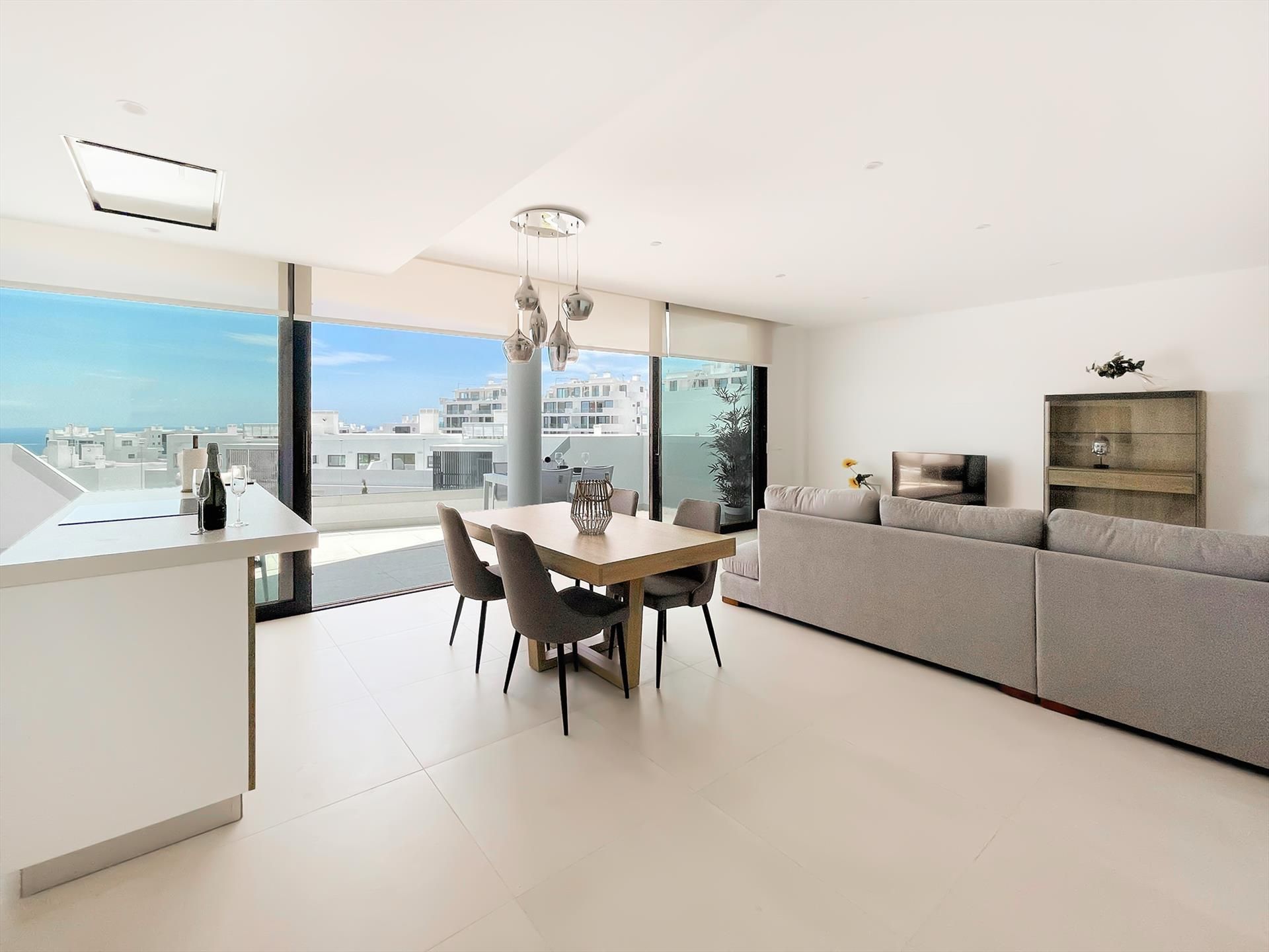 - amplio salón-comedor con cocina abierta y amplias puertas correderas a la terraza con vistas al mar y a la piscina