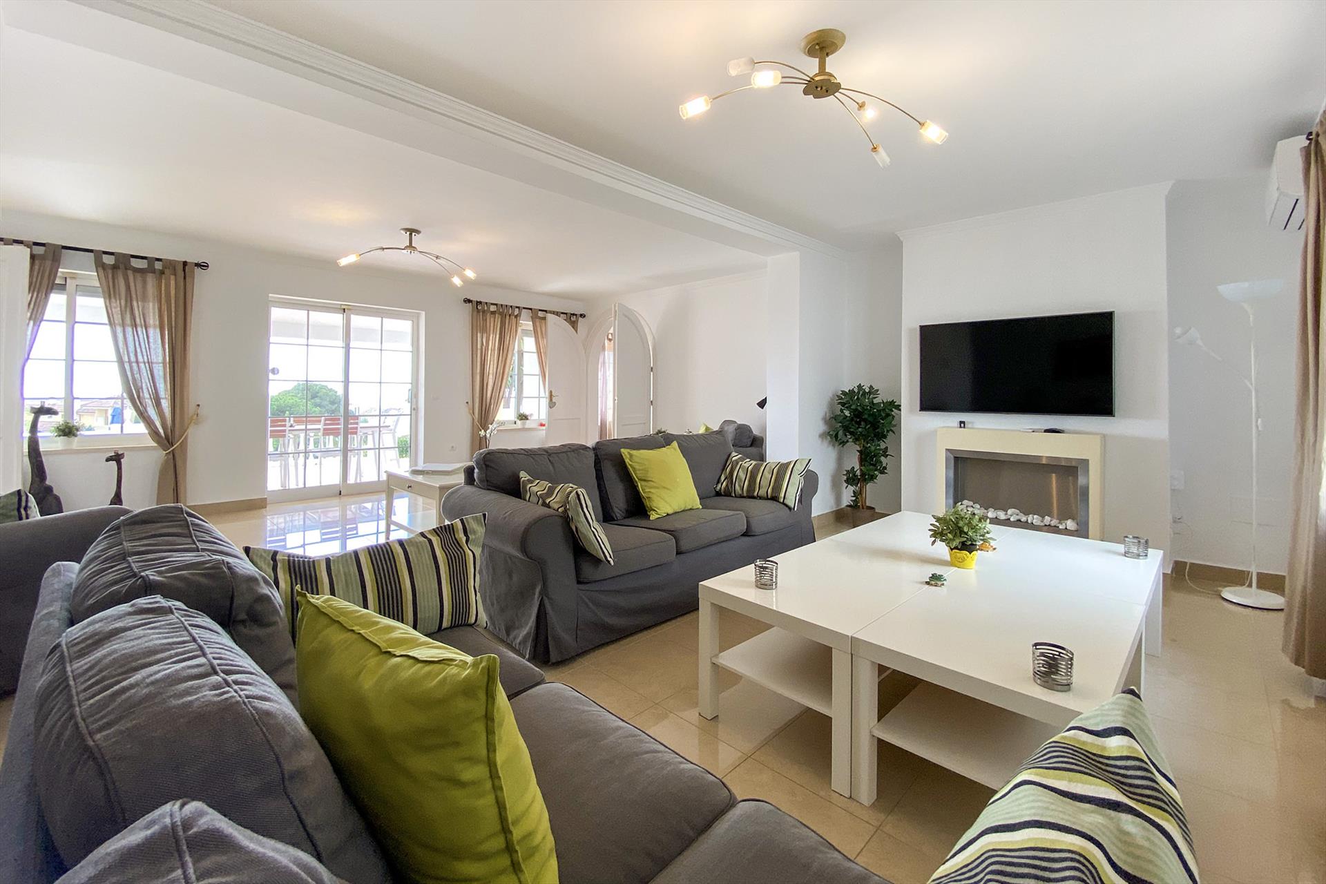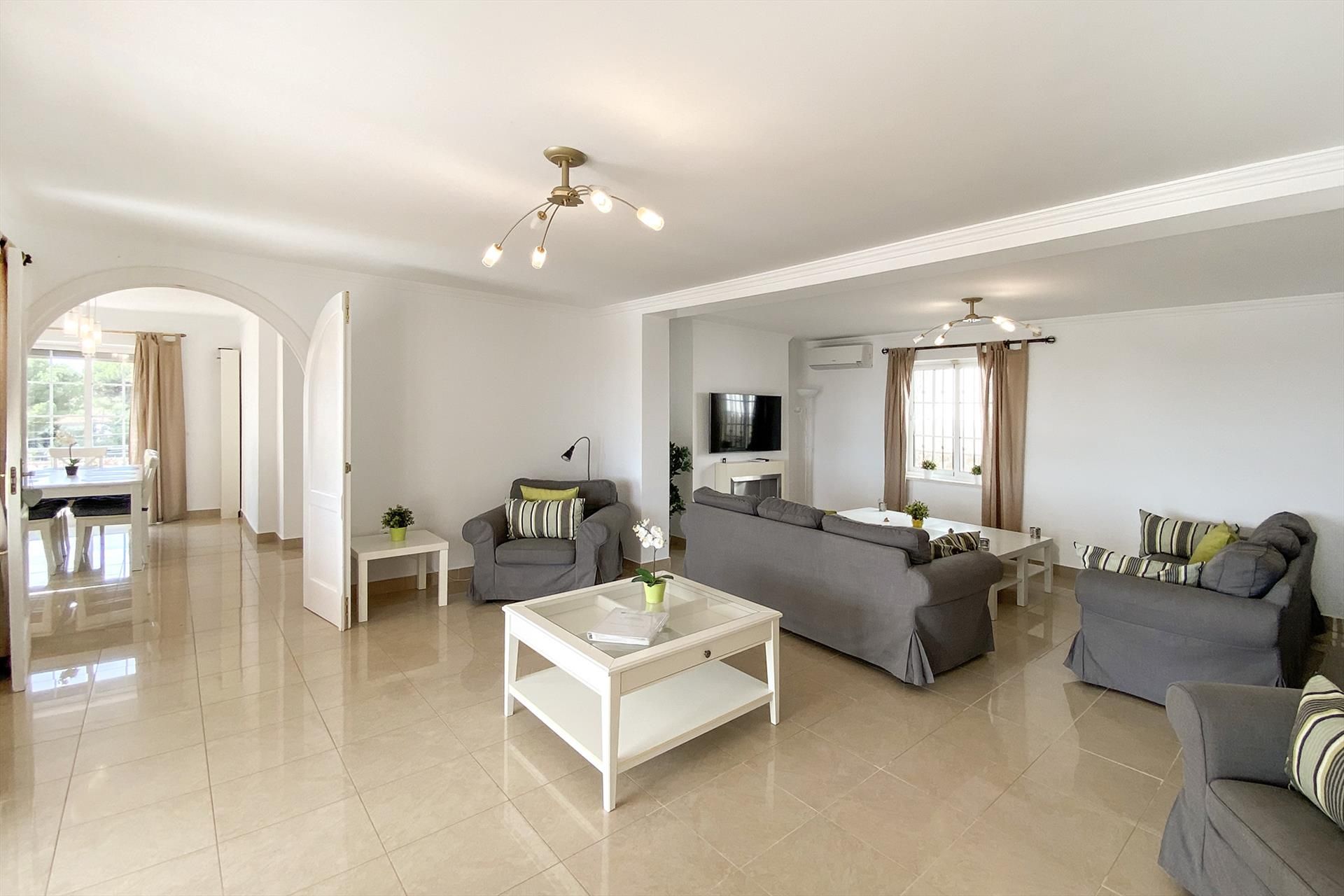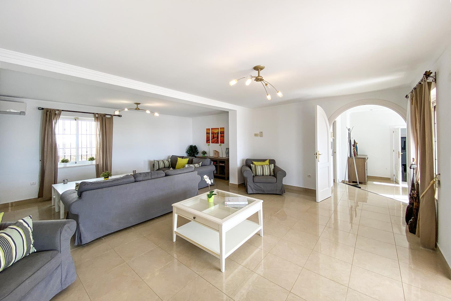 El chalet de una sola planta cuenta con un amplio salón y una cocina con comedor independiente. Hay 4 dormitorios, 3 baños y aire acondicionado para refrigeración y calefacción en todas las habitaciones. El chalet tiene un jardín privado totalmente cerrado con piscina privada, varias terrazas con fantásticas vistas al mar y aparcamiento cerrado en la parcela. El chalet está en un nivel con dos escalones de diferencia entre la zona de estar y los dormitorios. Se entra en el vestíbulo con la zona de estar a la izquierda y la zona de dormir a la derecha. Desde el amplio salón se accede al comedor adyacente, seguido de la cocina totalmente equipada con lavadero. En la zona de descanso hay 4 dormitorios, dos de ellos con baño en suite, más dos dormitorios con baño compartido. En las terrazas y en el jardín que rodea del chalet podrá relajarse y descansar en una de las tumbonas o disfrutar de una deliciosa comida en la amplia mesa de comedor con 8 sillas en la terraza cubierta. Siempre puedes encontrar un lugar al sol o a la sombra. Se accede al chalet a través de un camino privado (con cerradura) que ofrece aparcamiento para 2 coches. Desde el camino de entrada se llega al chalet ligeramente elevada a través de escaleras (acceso difícil para las personas que tienen dificultad para subir escaleras) El chalet es ideal para 8 personas y es el lugar perfecto para disfrutar de unas vacaciones tranquilas y relajantes cerca de la playa con una familia grande, amigos o un grupo de golfistas.