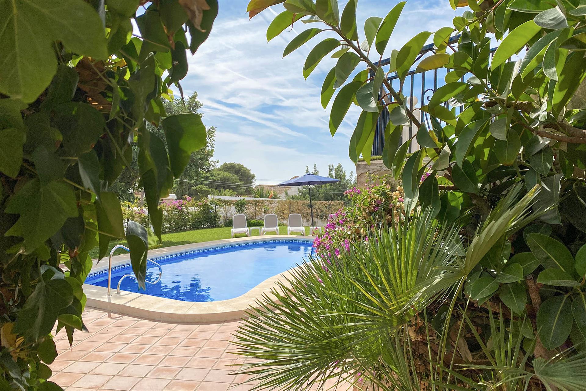 Jardín privado con piscina y varias terrazas, donde podrá disfrutar del sol o la sombra y de unas fantásticas vistas.