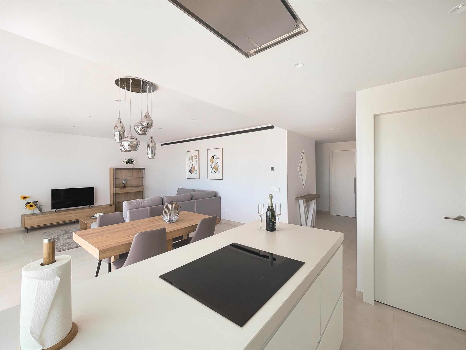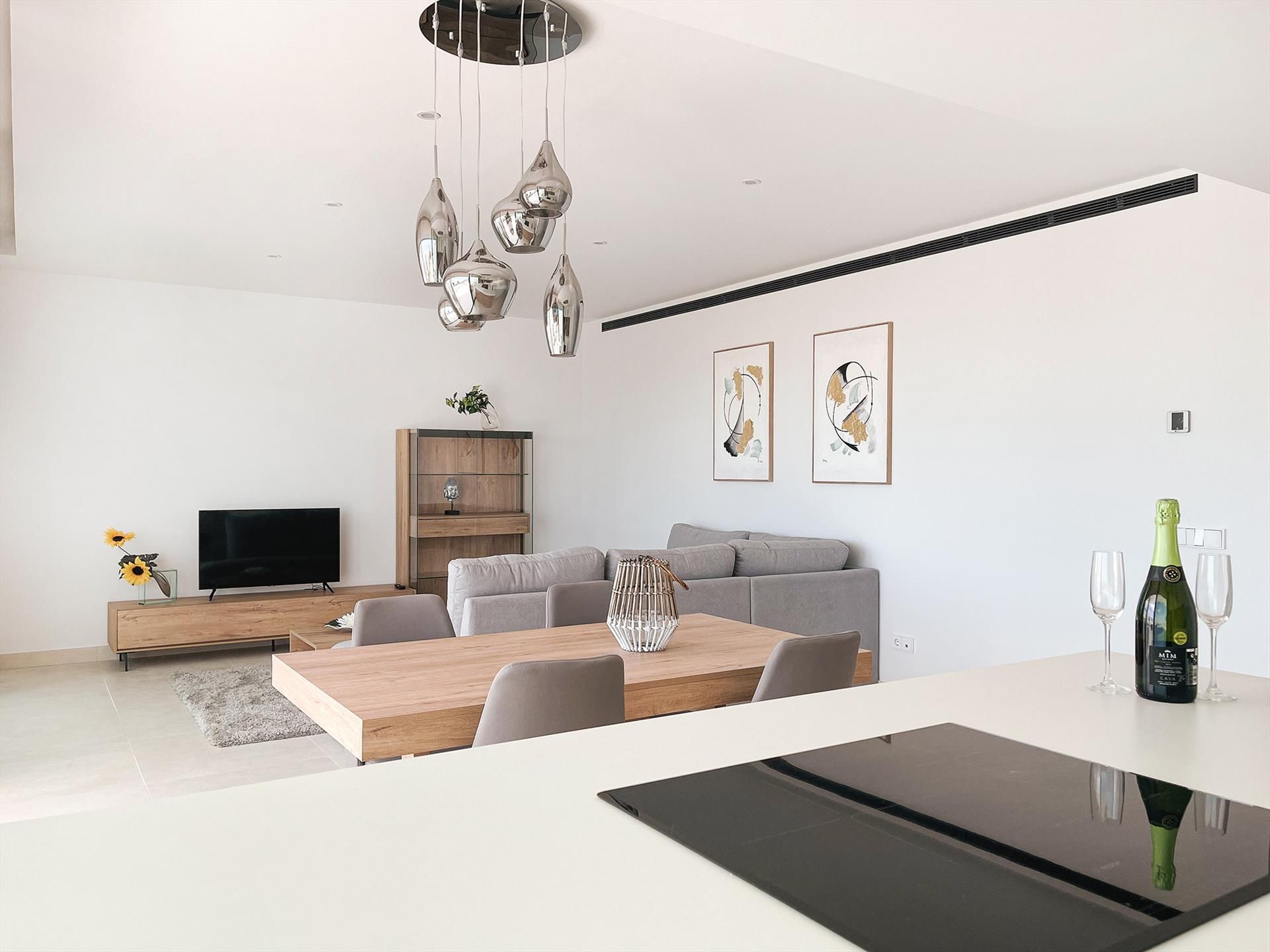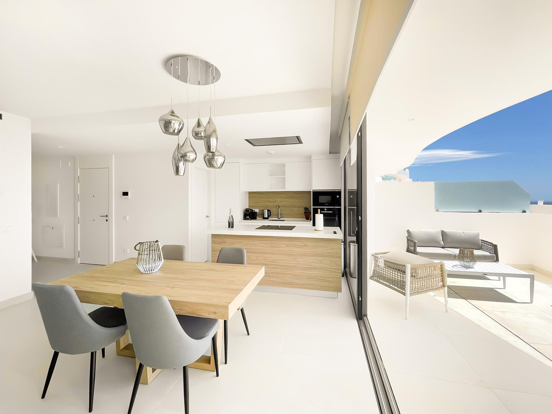 - amplio salón-comedor con cocina abierta y amplias puertas correderas a la terraza con vistas al mar y a la piscina