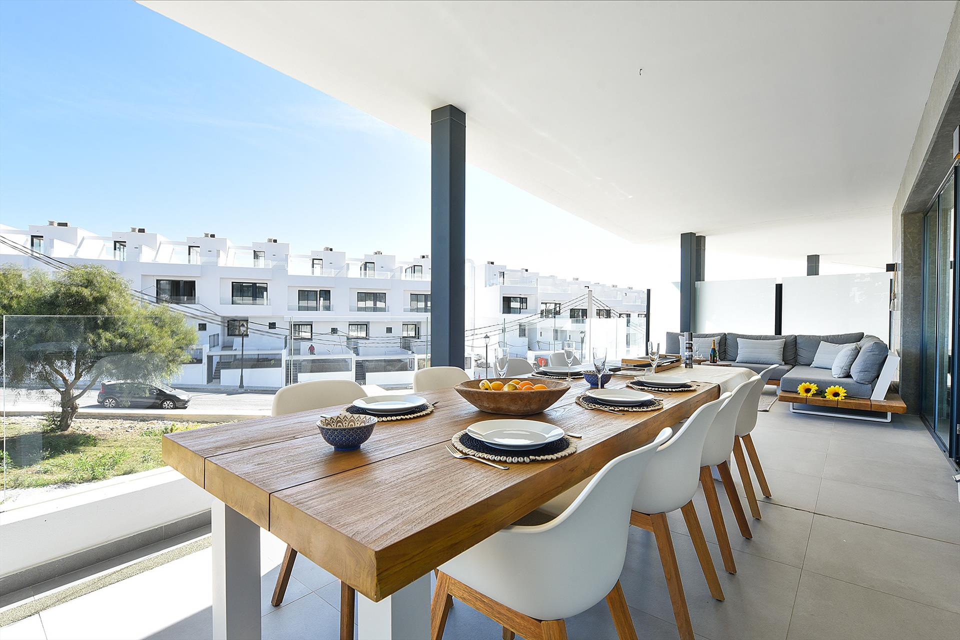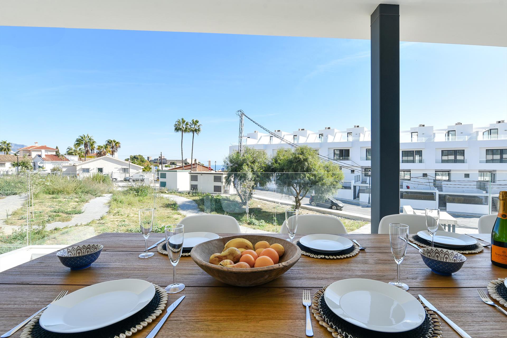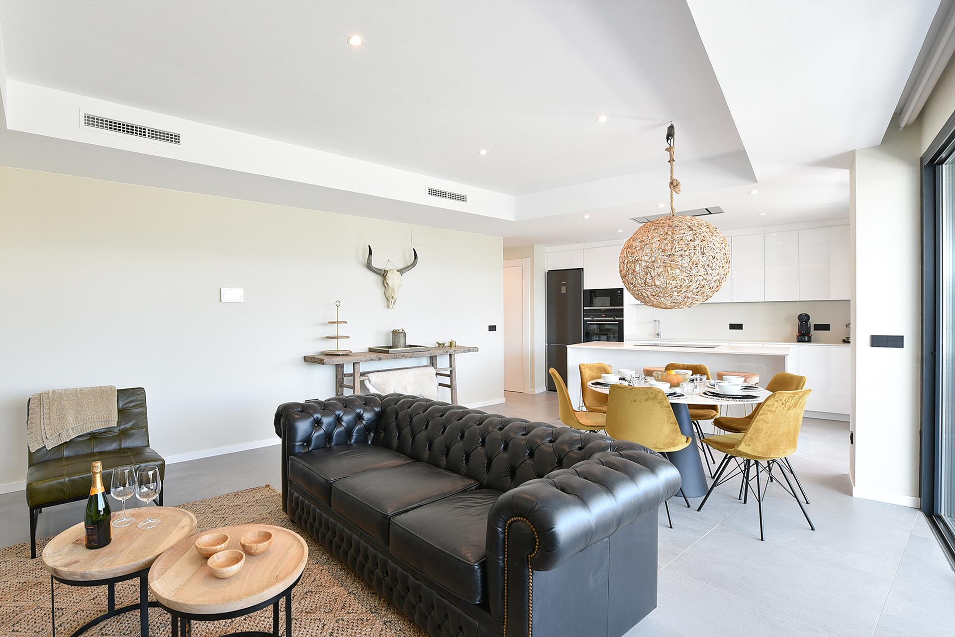 Este lujoso apartamento de vacaciones a estrenar tiene 2 dormitorios, 2 baños y una amplia terraza con vista parcial al mar. Situado en el centro del complejo de lujo The View. El apartamento tiene un amplio salón con un cómodo mobiliario de estilo vintage, una zona de comedor con 6 sillas, una cocina abierta, puertas correderas a la terraza, una TV de pantalla plana con canales espanoles e internacionales y WiFi gratuita. La amplia terraza cubierta orientada al sureste tiene una gran mesa de terraza con 8 sillas y un lujoso sofá de salón. El apartamento de vacaciones está situado en la 1ª planta con ascensor. Hay 2 plazas de aparcamiento privado en el garaje bajo el edificio con acceso al piso en ascensor.
