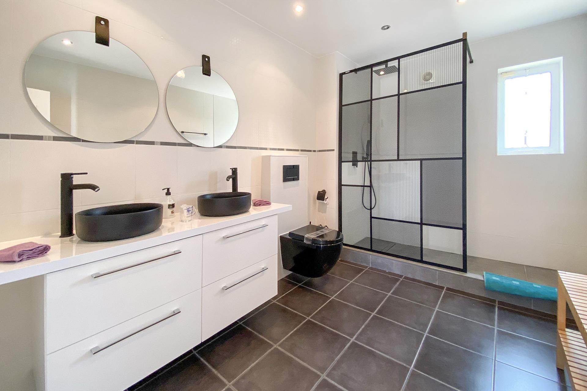 Hay tres baños en total. Todos los baños fueron completamente renovados en 2022. El primer cuarto de baño en suite tiene una ducha a ras de suelo, un lavabo y un inodoro. El segundo cuarto de baño en suite también tiene una ducha a ras de suelo, un lavabo y un inodoro. El tercer baño tiene una ducha a ras de suelo, un mueble de baño con 2 lavabos, un inodoro y un föhn.