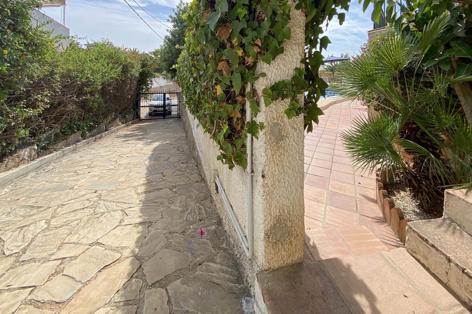 El chalet de una sola planta cuenta con un amplio salón y una cocina con comedor independiente. Hay 4 dormitorios, 3 baños y aire acondicionado para refrigeración y calefacción en todas las habitaciones. El chalet tiene un jardín privado totalmente cerrado con piscina privada, varias terrazas con fantásticas vistas al mar y aparcamiento cerrado en la parcela. El chalet está en un nivel con dos escalones de diferencia entre la zona de estar y los dormitorios. Se entra en el vestíbulo con la zona de estar a la izquierda y la zona de dormir a la derecha. Desde el amplio salón se accede al comedor adyacente, seguido de la cocina totalmente equipada con lavadero. En la zona de descanso hay 4 dormitorios, dos de ellos con baño en suite, más dos dormitorios con baño compartido. En las terrazas y en el jardín que rodea del chalet podrá relajarse y descansar en una de las tumbonas o disfrutar de una deliciosa comida en la amplia mesa de comedor con 8 sillas en la terraza cubierta. Siempre puedes encontrar un lugar al sol o a la sombra. Se accede al chalet a través de un camino privado (con cerradura) que ofrece aparcamiento para 2 coches. Desde el camino de entrada se llega al chalet ligeramente elevada a través de escaleras (acceso difícil para las personas que tienen dificultad para subir escaleras) El chalet es ideal para 8 personas y es el lugar perfecto para disfrutar de unas vacaciones tranquilas y relajantes cerca de la playa con una familia grande, amigos o un grupo de golfistas.