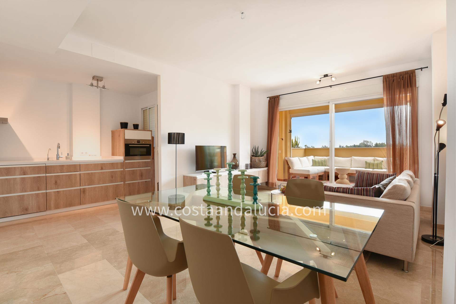 • Salón amplio con cocina abierta y puertas correderas a la terraza orientada al sur.