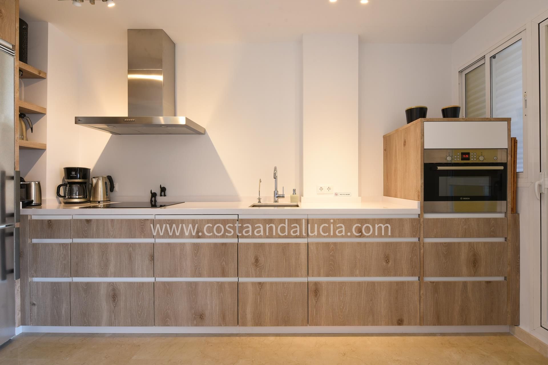 Lujosa cocina americana con vitrocerámica, campana extractora, horno, microondas, nevera con congelador, lavavajillas, cafetera, hervidor, tostadora de pan y encimera de silestone.