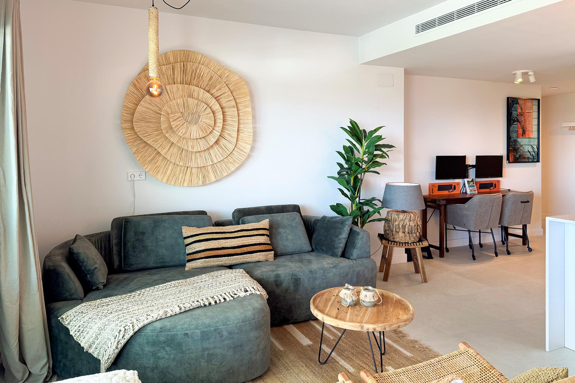 - Salón con sofá lounge y dos sillas, un escritorio/estación de trabajo con dos pantallas, una cocina abierta con barra de desayuno con cuatro taburetes de bar y puertas correderas a la terraza