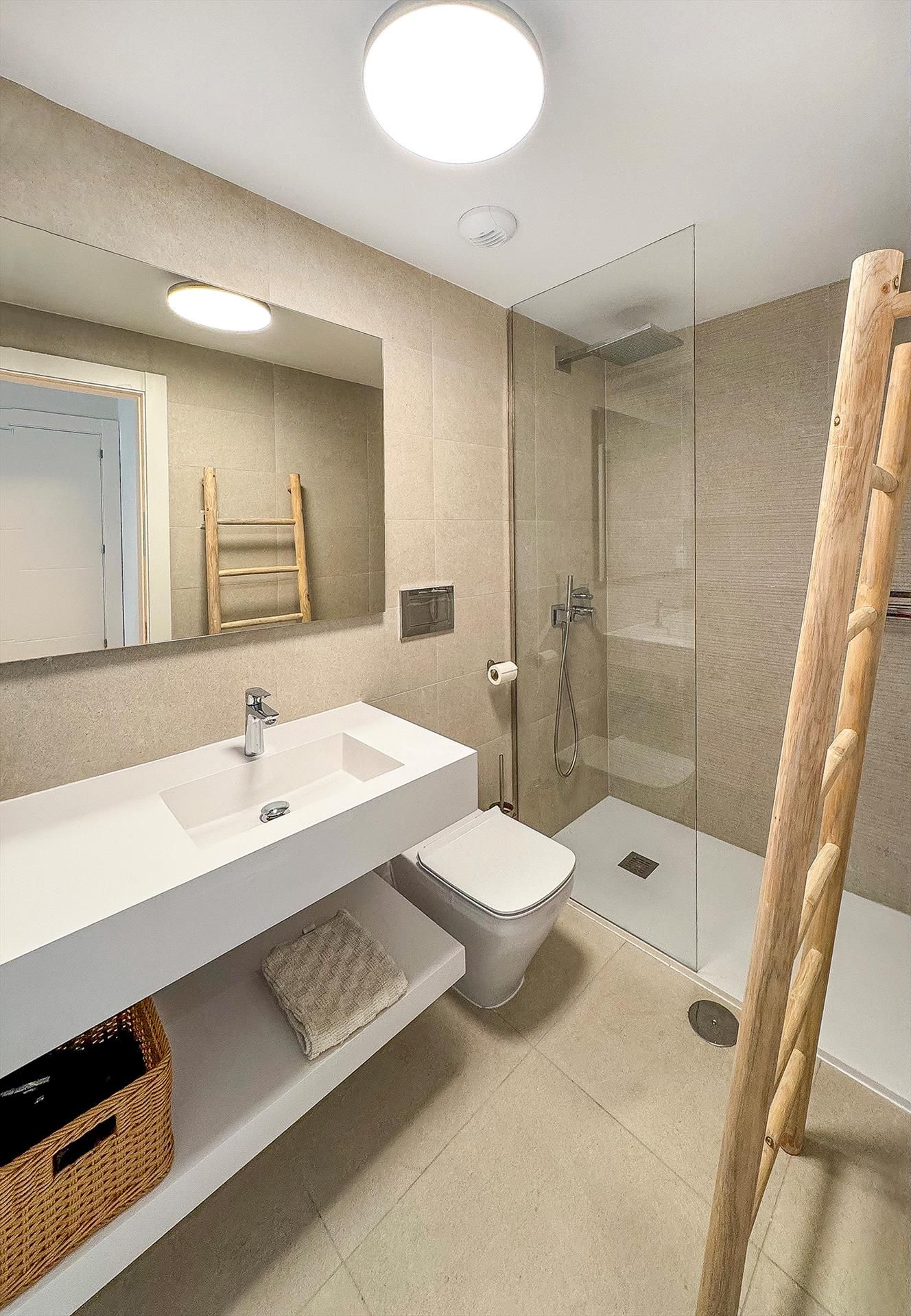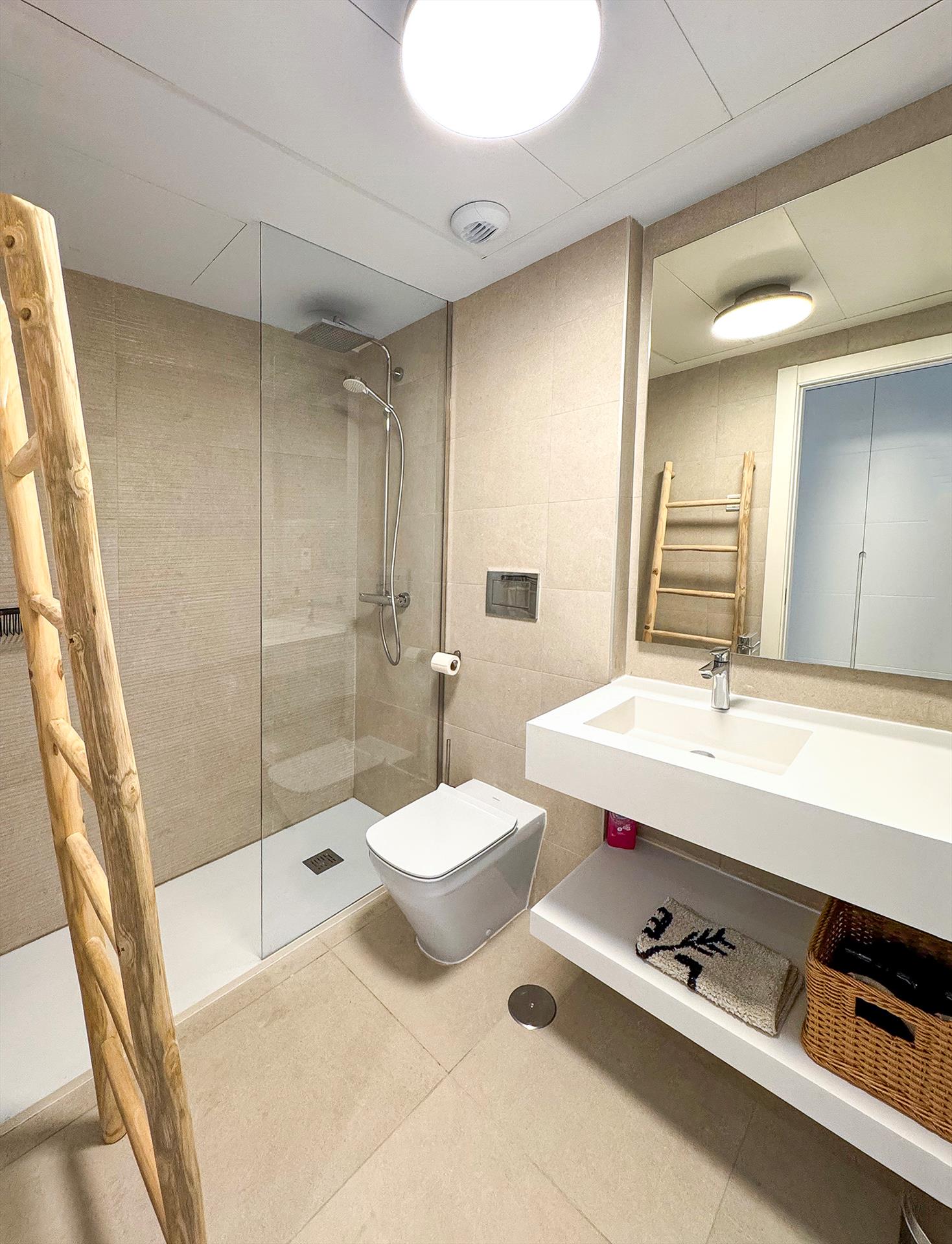 Hay 2 cuartos de baño, ambos con ducha, lavabo, inodoro y secador de pelo.