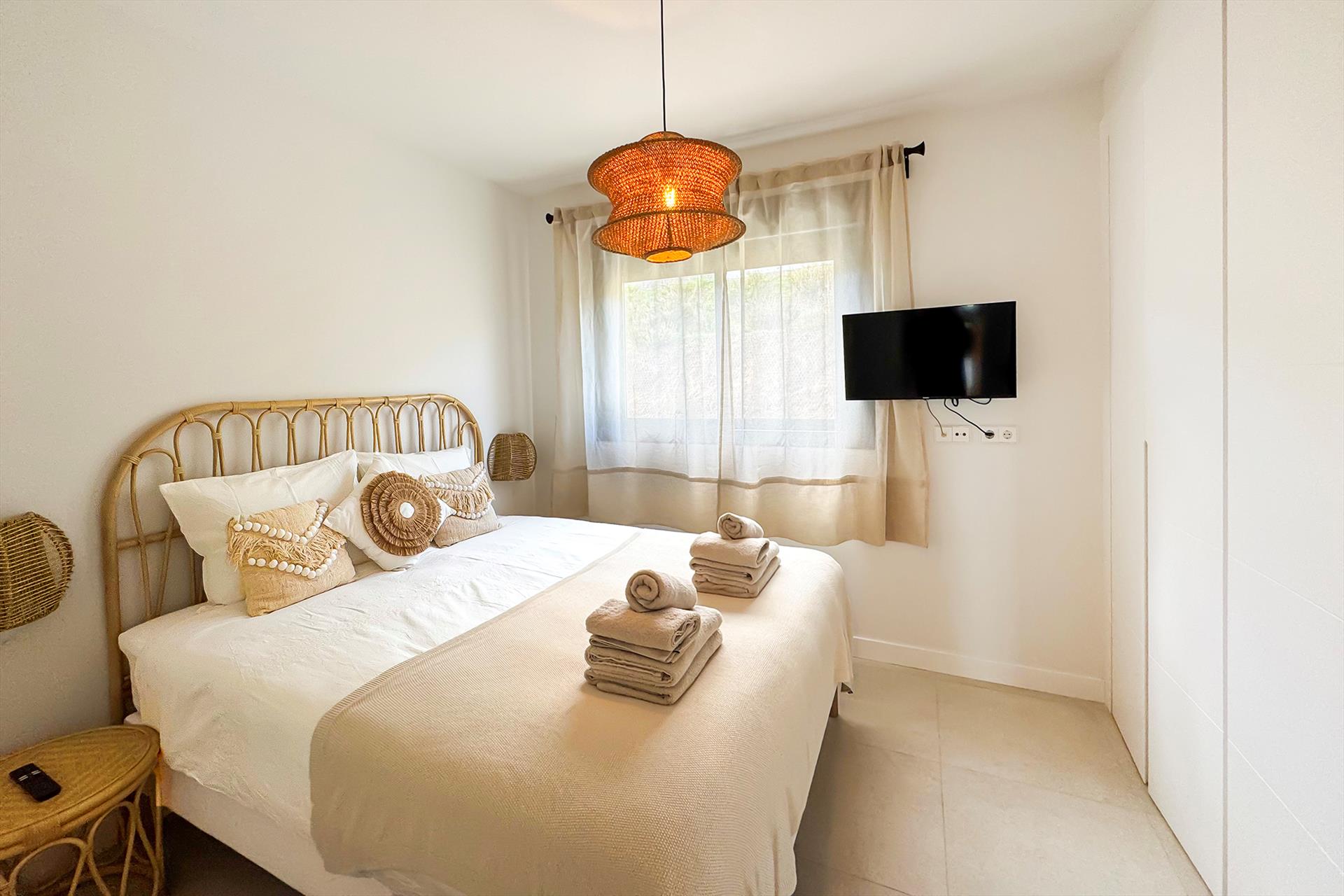 El dormitorio principal tiene una cama doble de 160x200cm y un televisor con canales españoles y otros canales internacionales incluyendo canales de deportes.