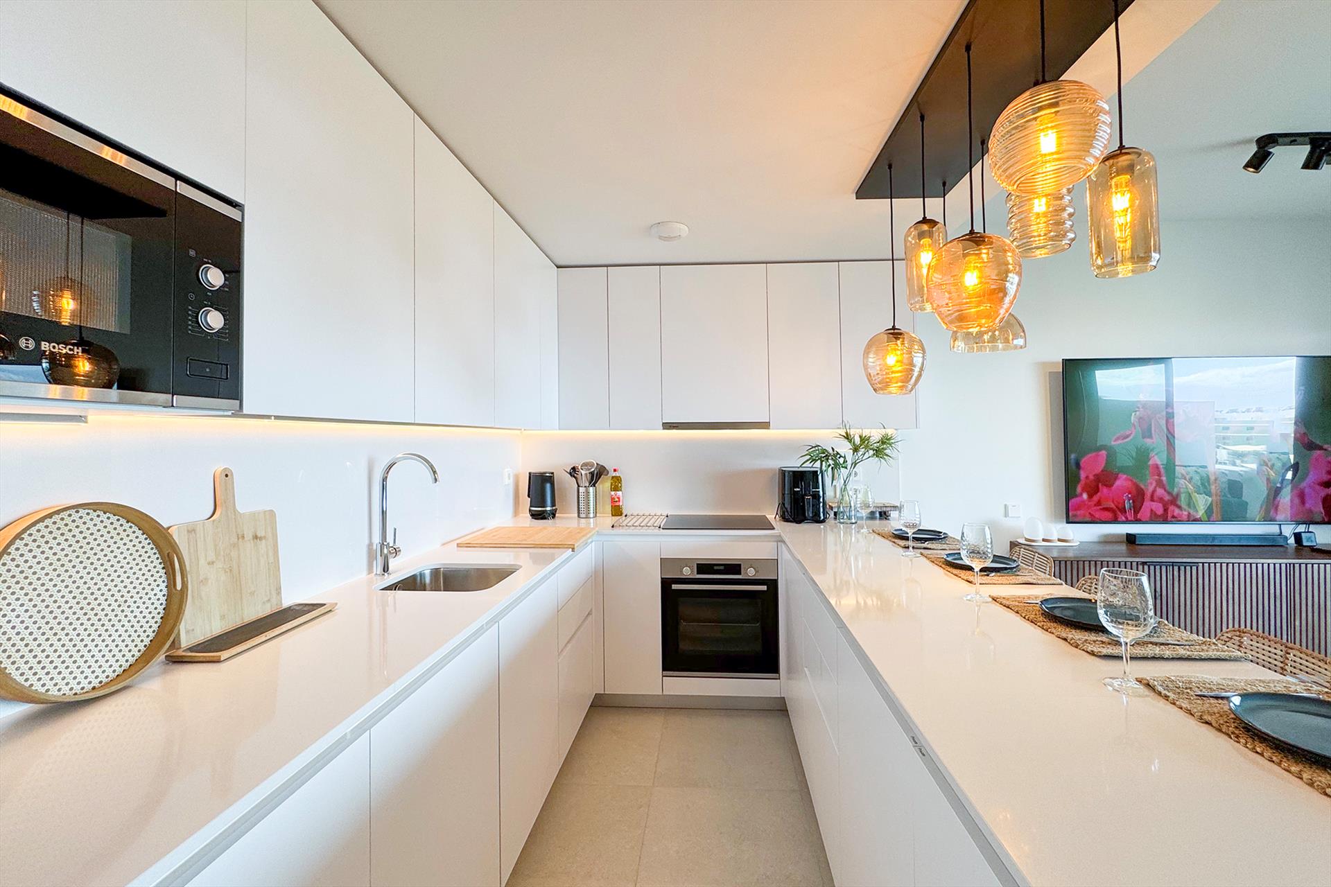 Cocina americana equipada con vitrocerámica, horno eléctrico, microondas, freidora de aire, lavavajillas, lavadora con tendedero, frigorífico/congelador, cafetera, hervidor de agua y tostadora.