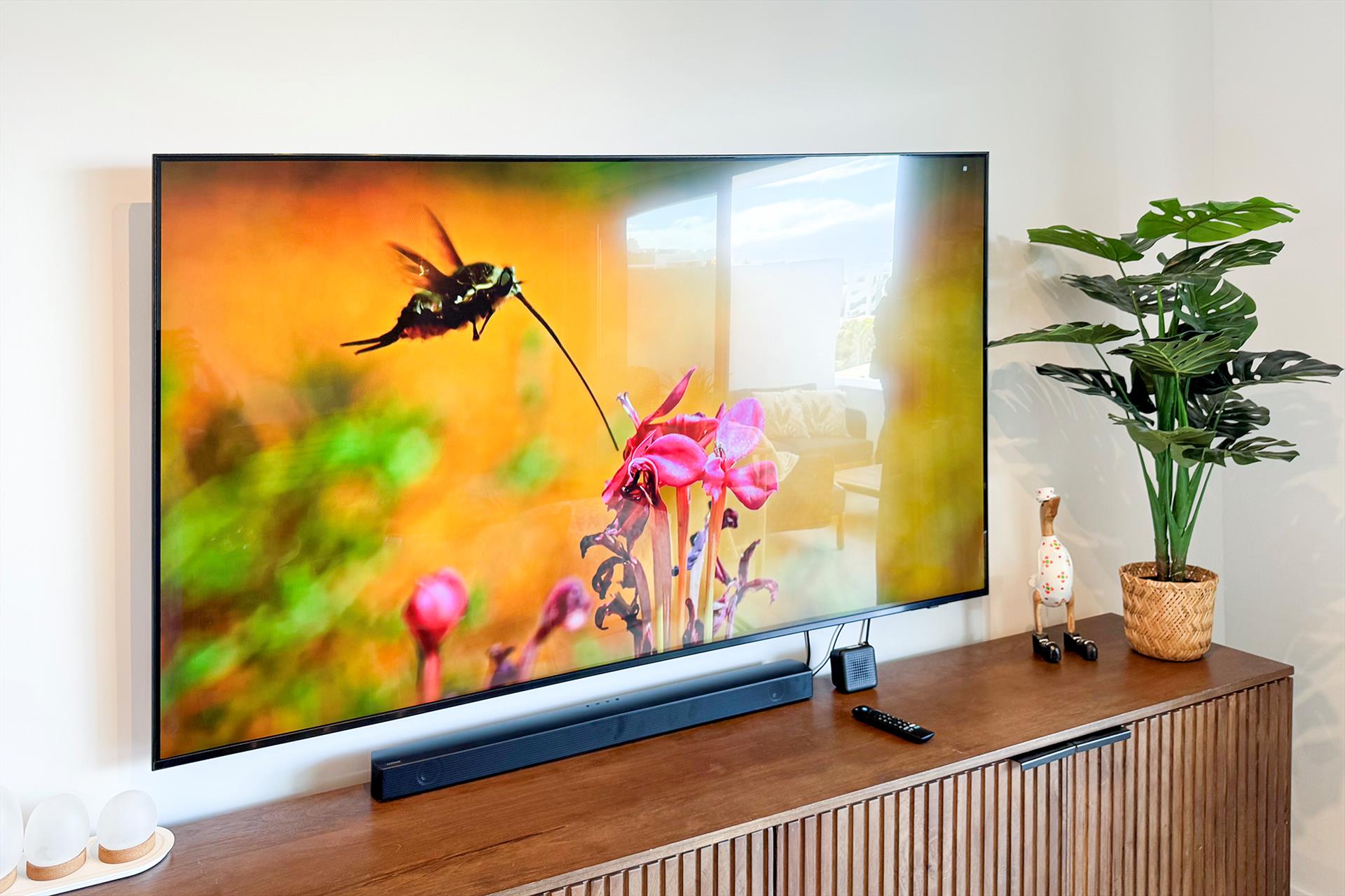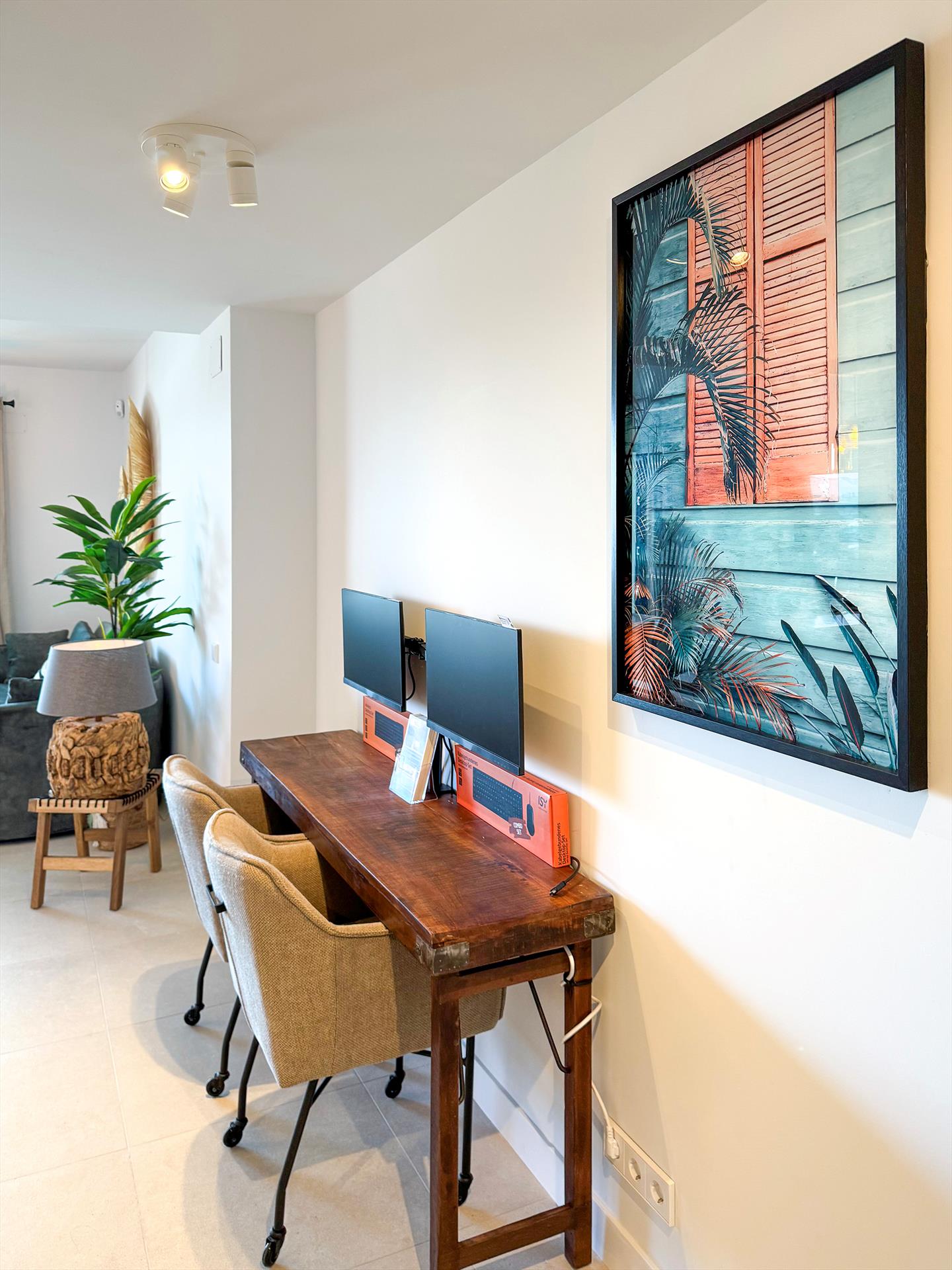 - Salón con sofá lounge y dos sillas, un escritorio/estación de trabajo con dos pantallas, una cocina abierta con barra de desayuno con cuatro taburetes de bar y puertas correderas a la terraza