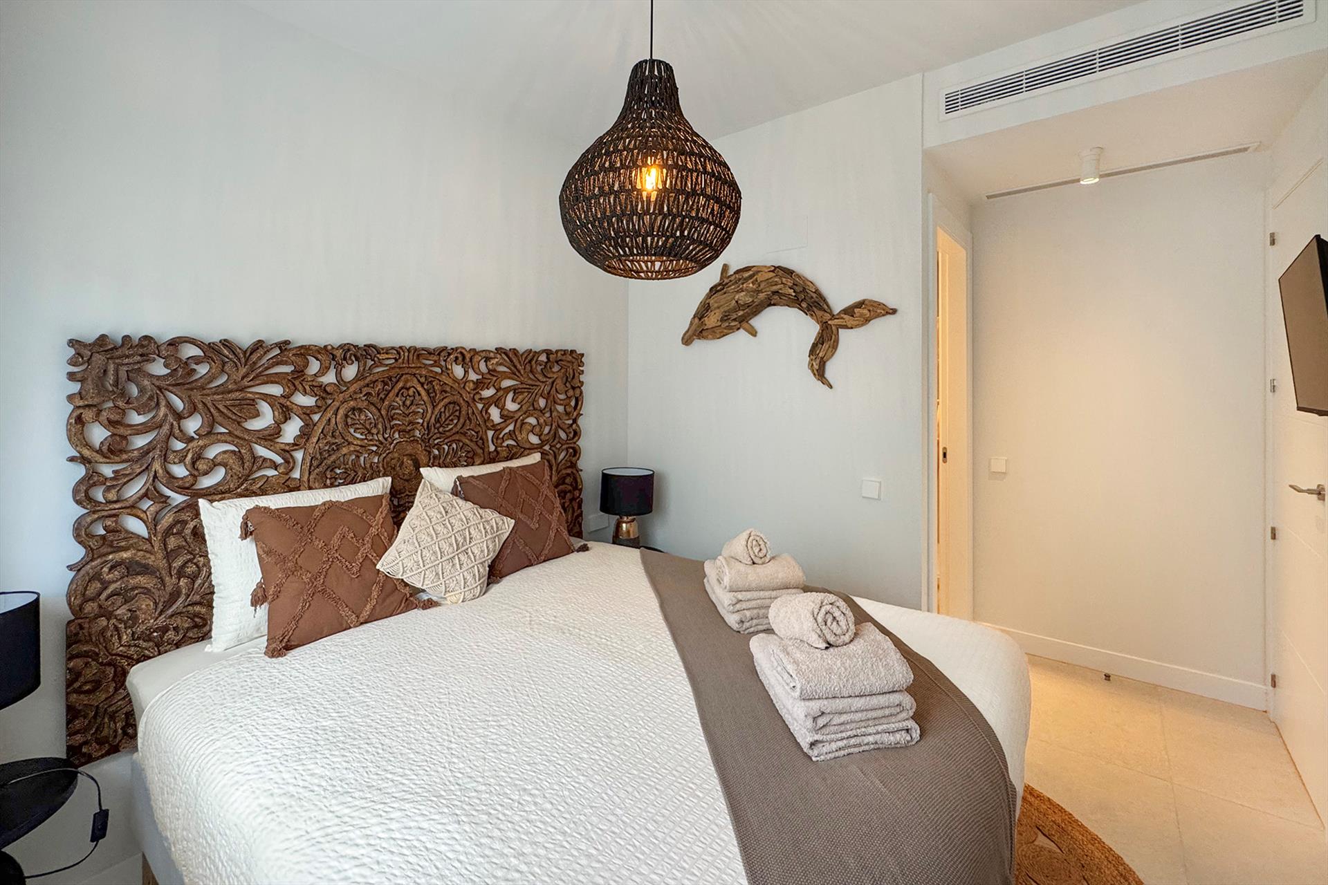 El dormitorio principal tiene una cama doble de 160x200cm y un televisor con canales españoles y otros canales internacionales incluyendo canales de deportes.