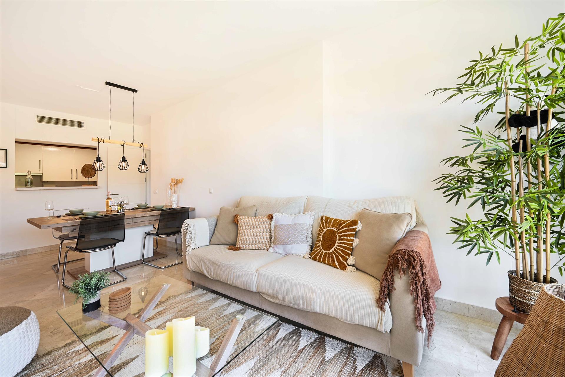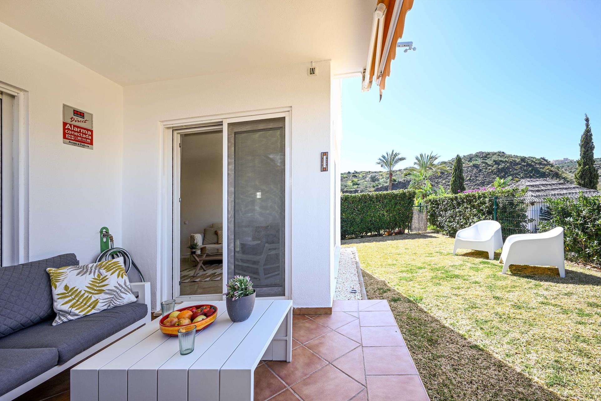 Este bonito apartamento amueblado está en la planta baja con jardín privado y terraza. Consta de una sala de estar con zona de estar y comedor, una cocina totalmente equipada, 2 dormitorios y 2 baños. El apartamento está situado en la bonita urbanización de Los Iris, a 500 metros de la casa club del campo de golf Cerrado del Águila, a las afueras de Fuengirola, en Mijas Costa. El apartamento está decorado con buen gusto y tiene excelentes camas. Dispone de TV de pantalla plana con canales españoles y otros canales internacionales y conexión Wi-Fi a internet gratuita. Las puertas correderas dan a la terraza cubierta y al jardín privado. Aquí encontrará un cómodo sofá-salón donde podrá relajarse al sol de la tarde. El apartamento está en la planta baja. Hay una plaza de aparcamiento privado gratuito en frente de la entrada al apartamento.