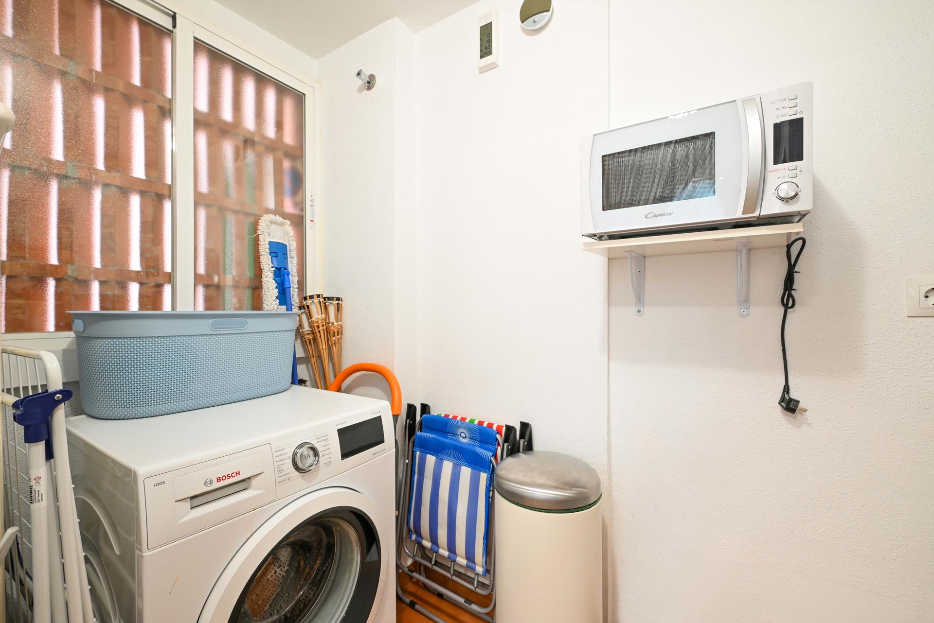 • Conectado a la cocina hay un lavadero con lavadora, microondas, tendedero, plancha con tabla de planchar y utensilios de limpieza.