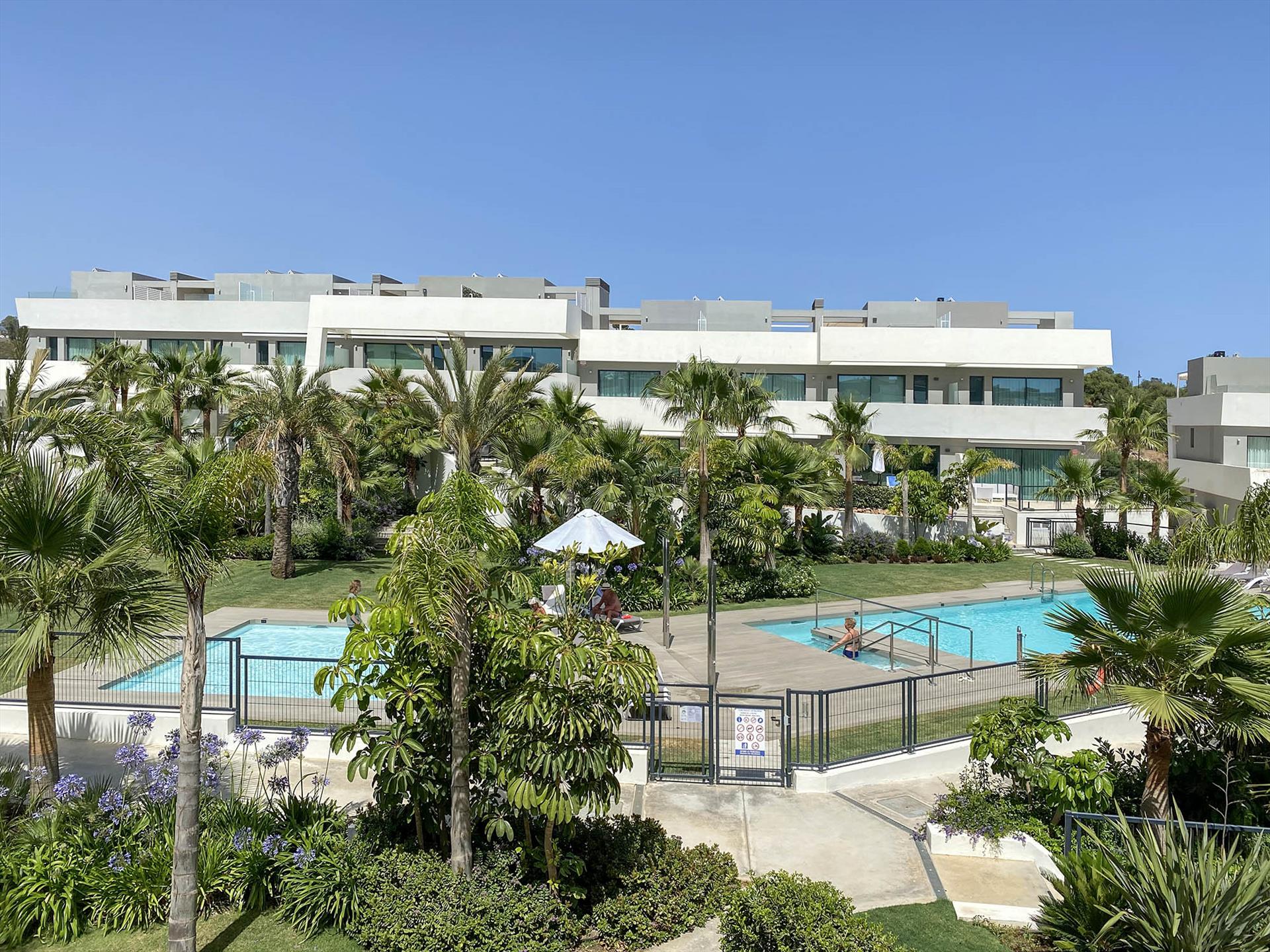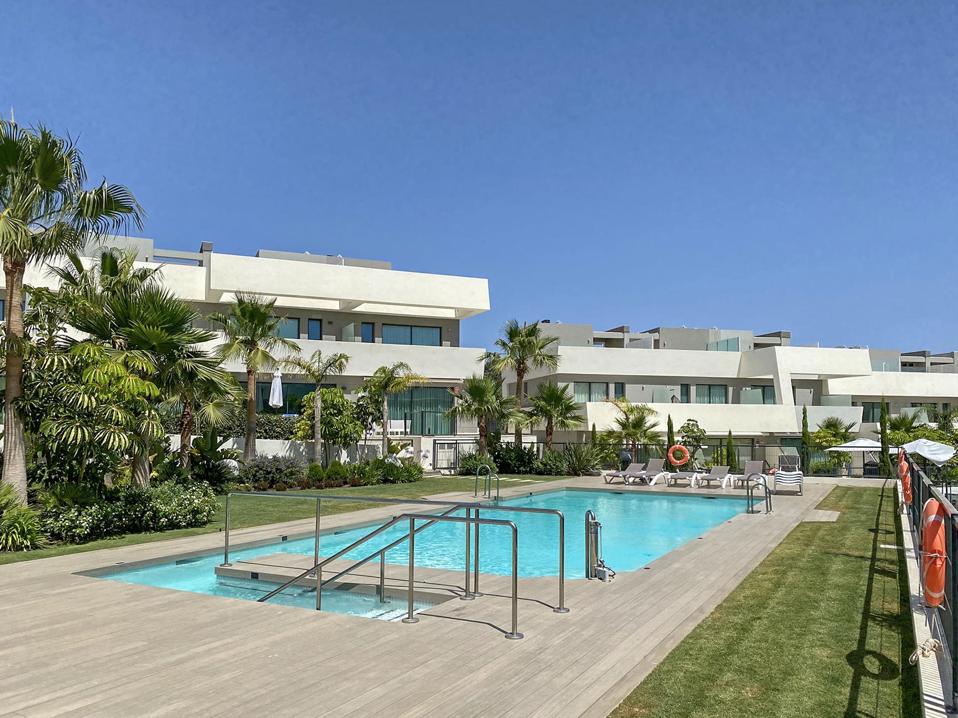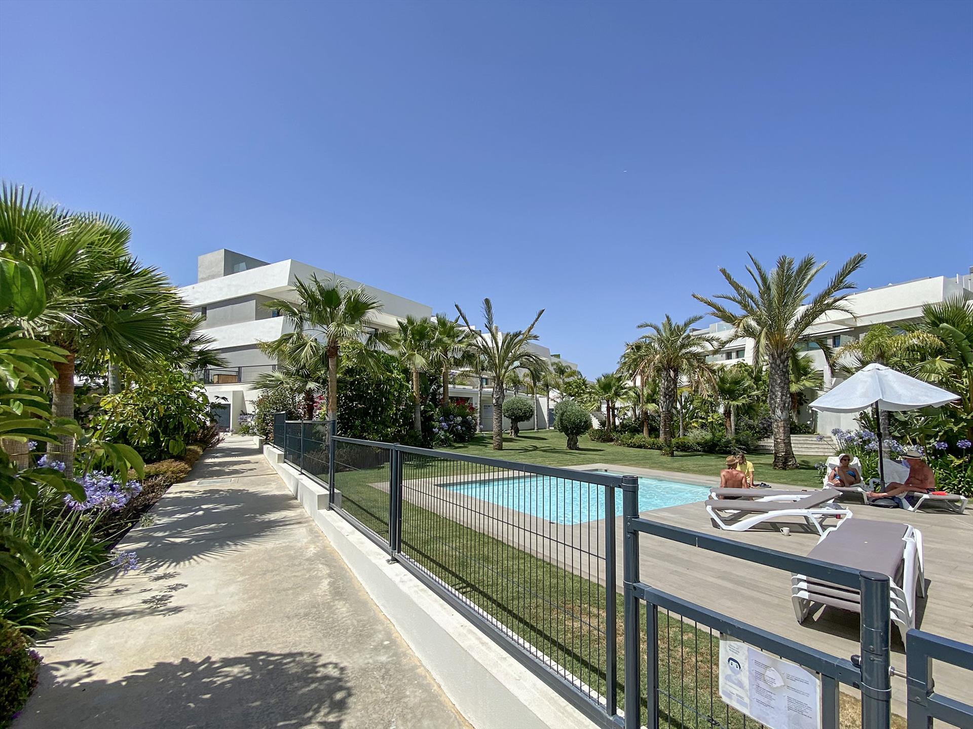 • desde el salón se accede a una gran terraza con 3 sofás dobles de salón y una mesa de bar con 6 taburetes de bar, seguido de un jardín privado con tumbonas y acceso directo al jardín comunitario con 3 piscinas.