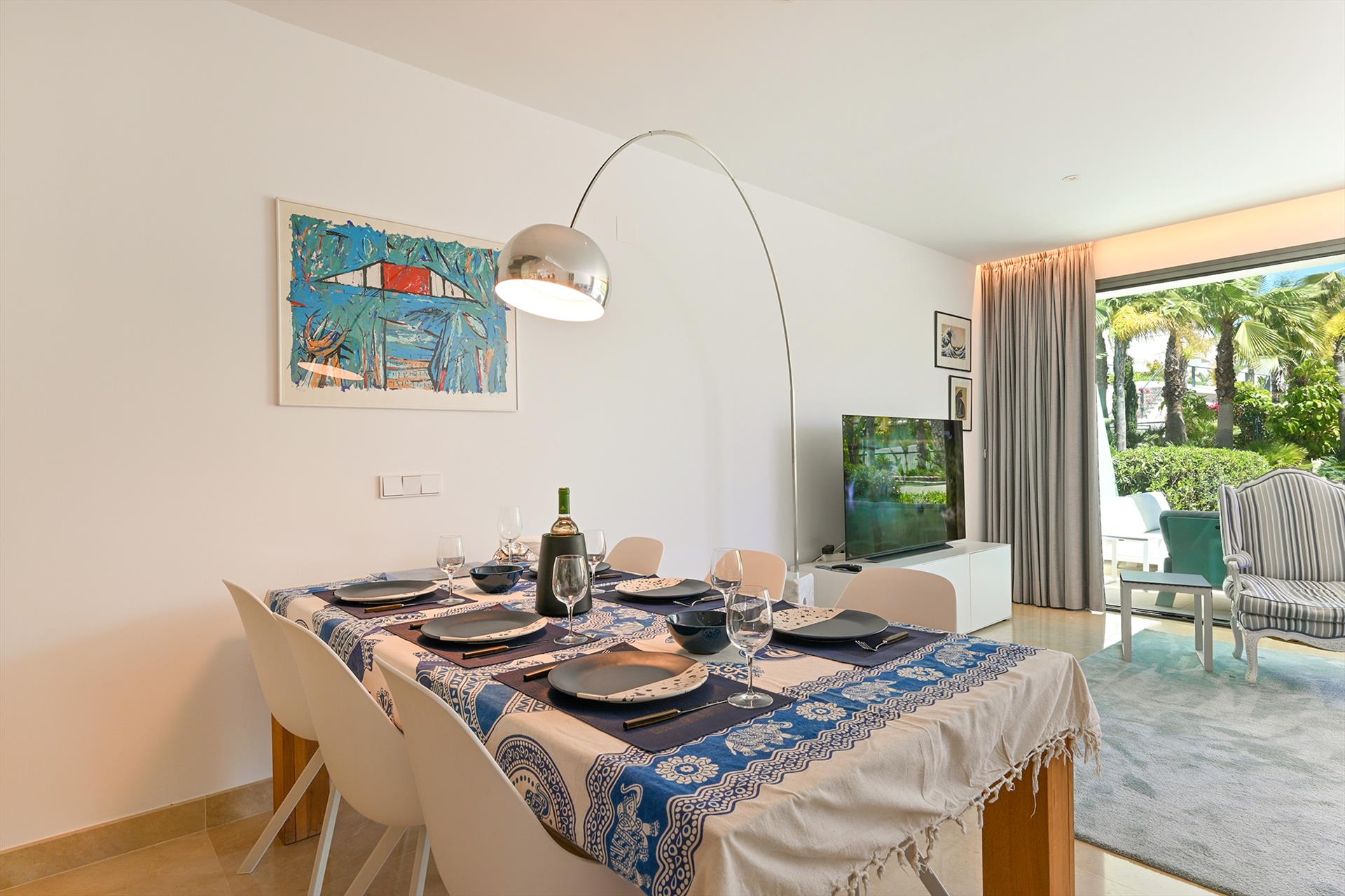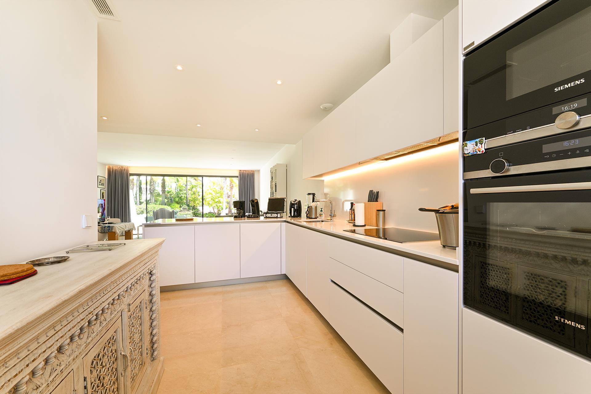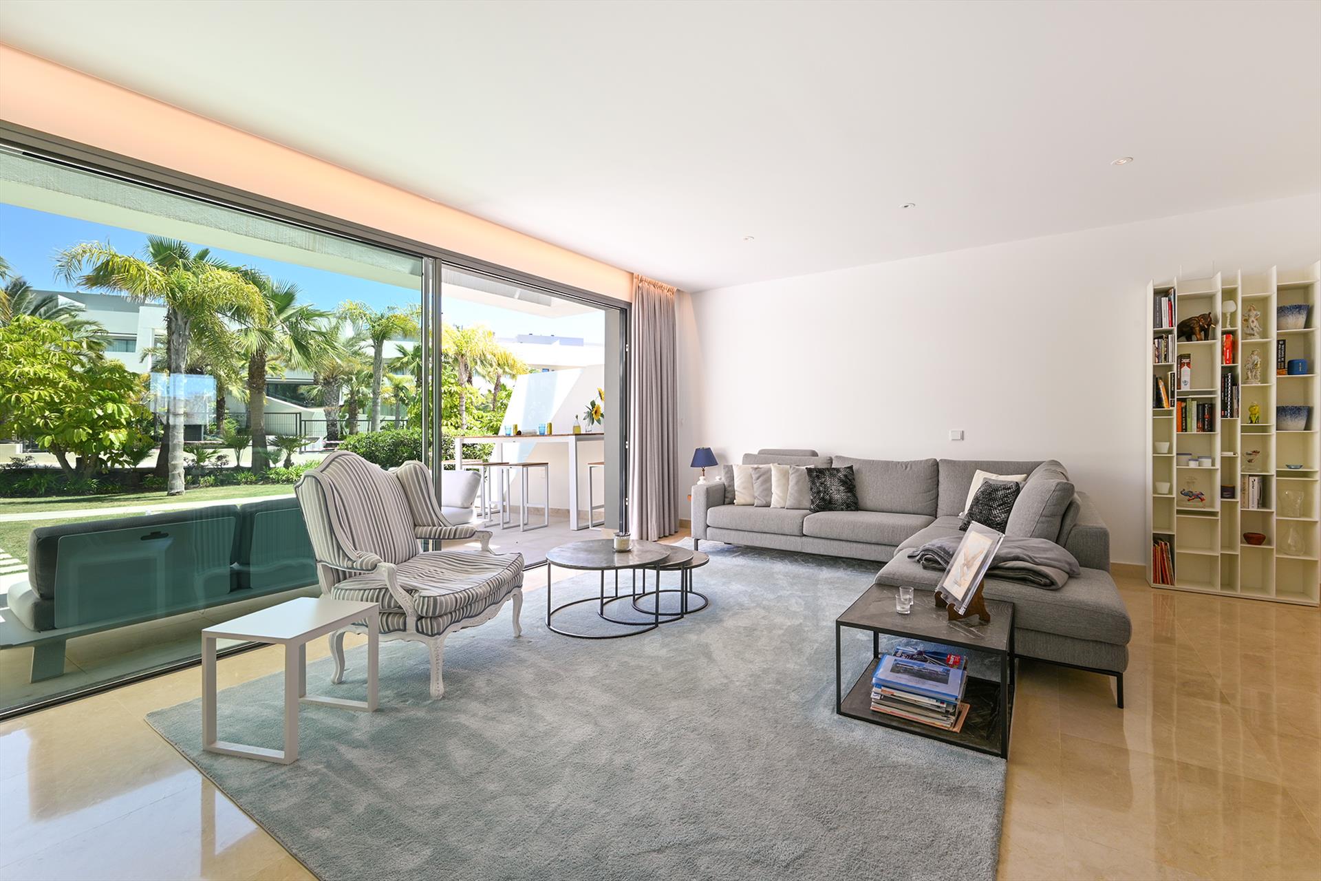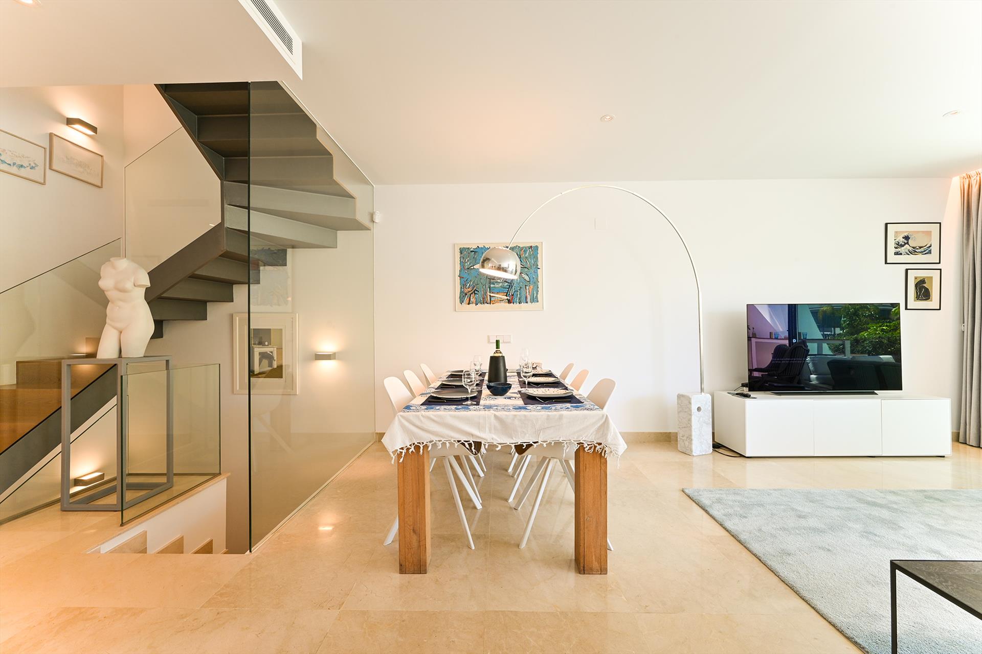 En la planta baja, el hall de entrada con aseo de invitados conduce al amplio salón / comedor con una moderna cocina americana totalmente equipada con barra americana. Puertas correderas de cristal conducen a la terraza privada. El elegante salón tiene una gran Smart TV con canales españoles e internacionales y muchos canales de deportes.