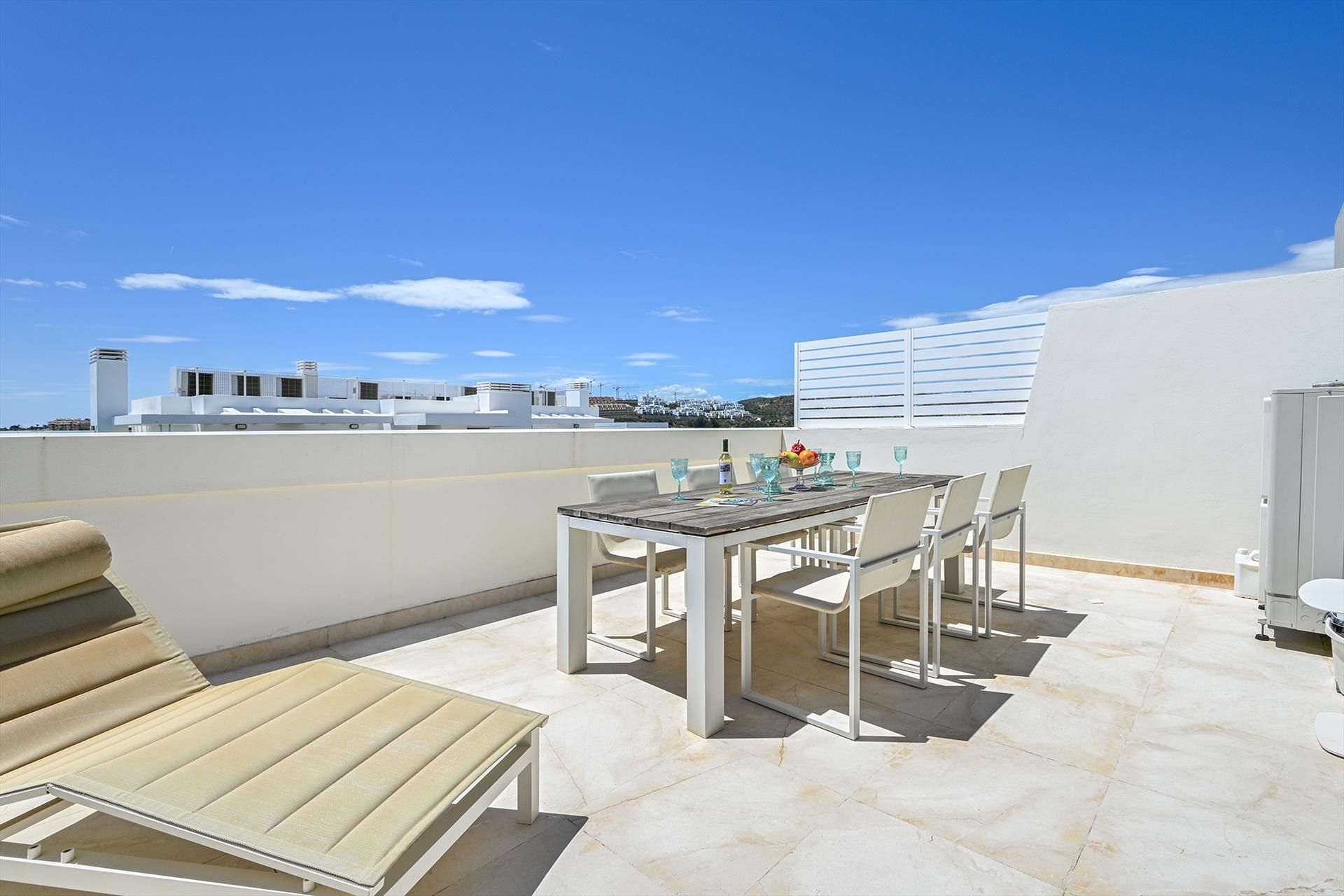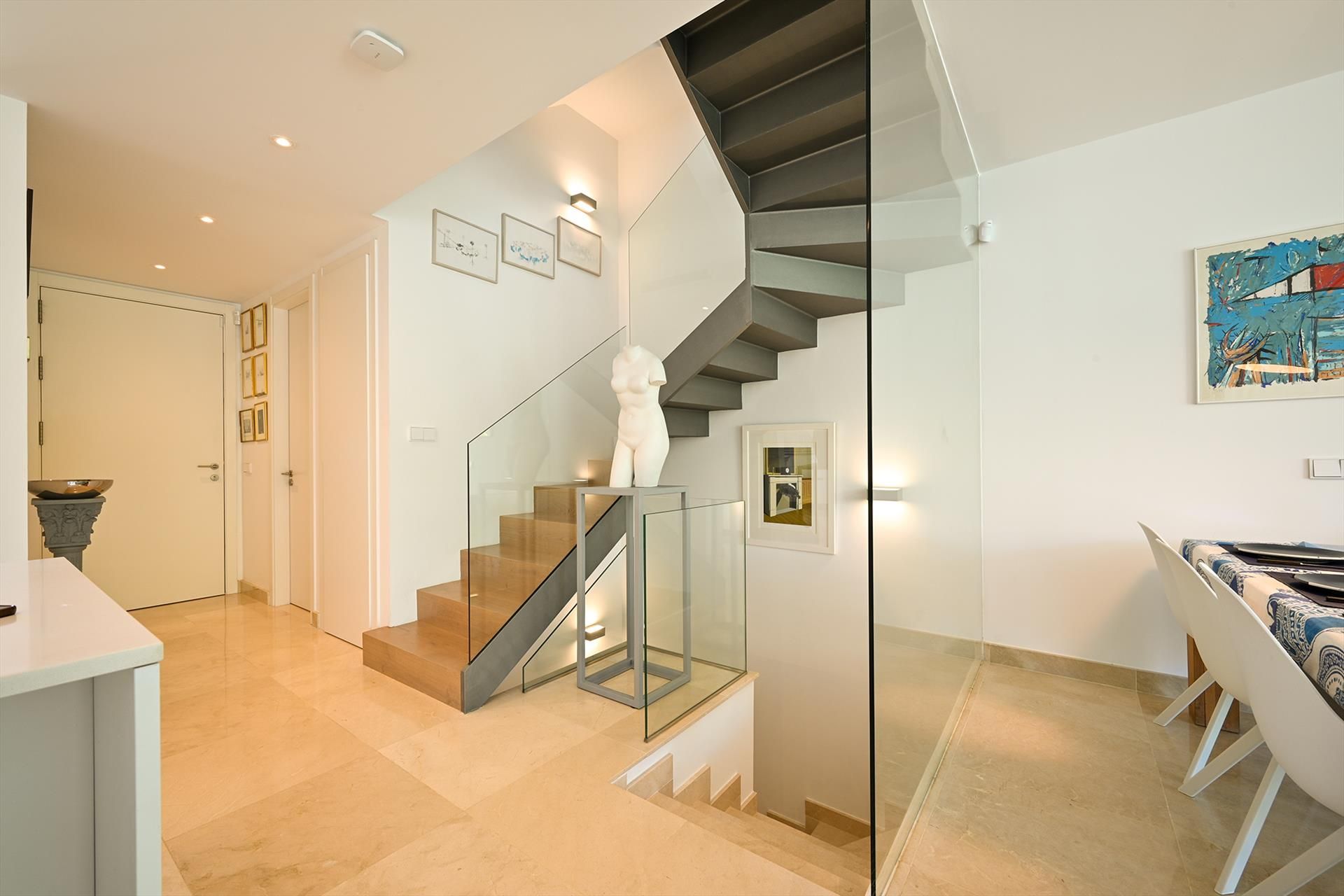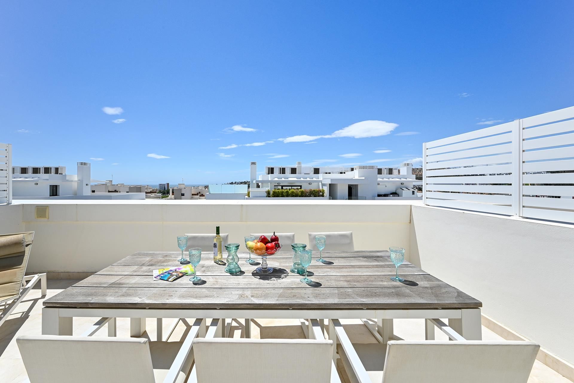 En la planta baja, el hall de entrada con aseo de invitados conduce al amplio salón / comedor con una moderna cocina americana totalmente equipada con barra americana. Puertas correderas de cristal conducen a la terraza privada. El elegante salón tiene una gran Smart TV con canales españoles e internacionales y muchos canales de deportes.