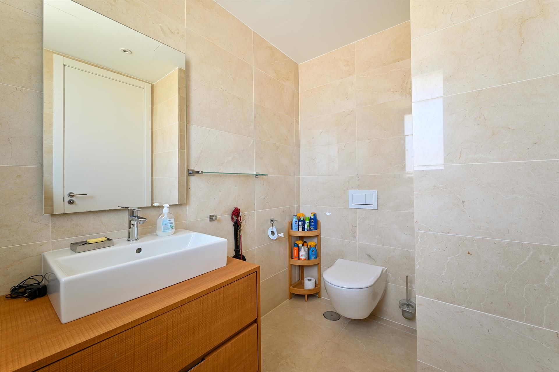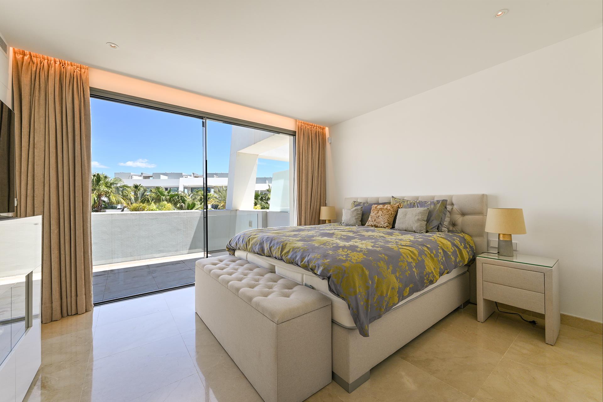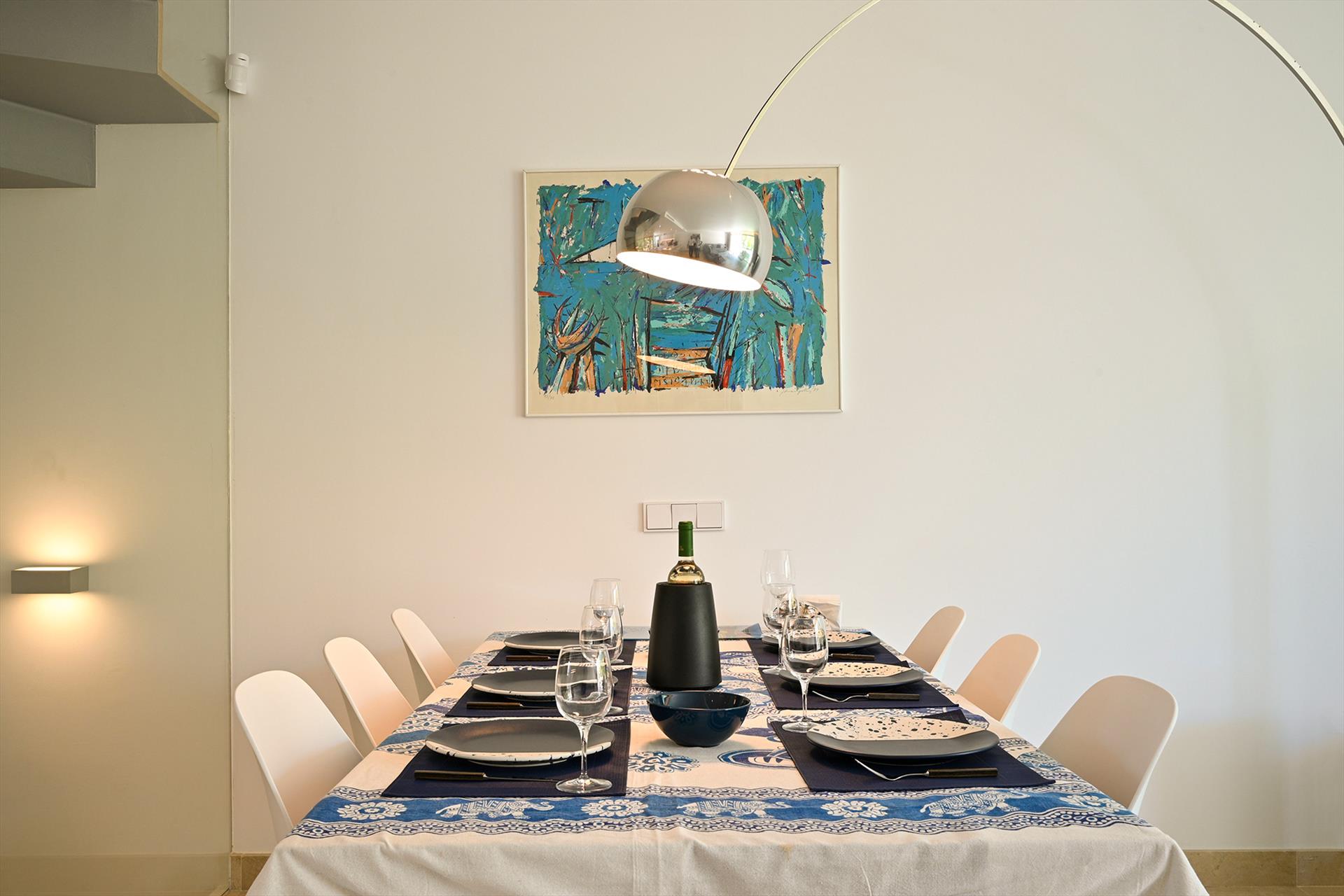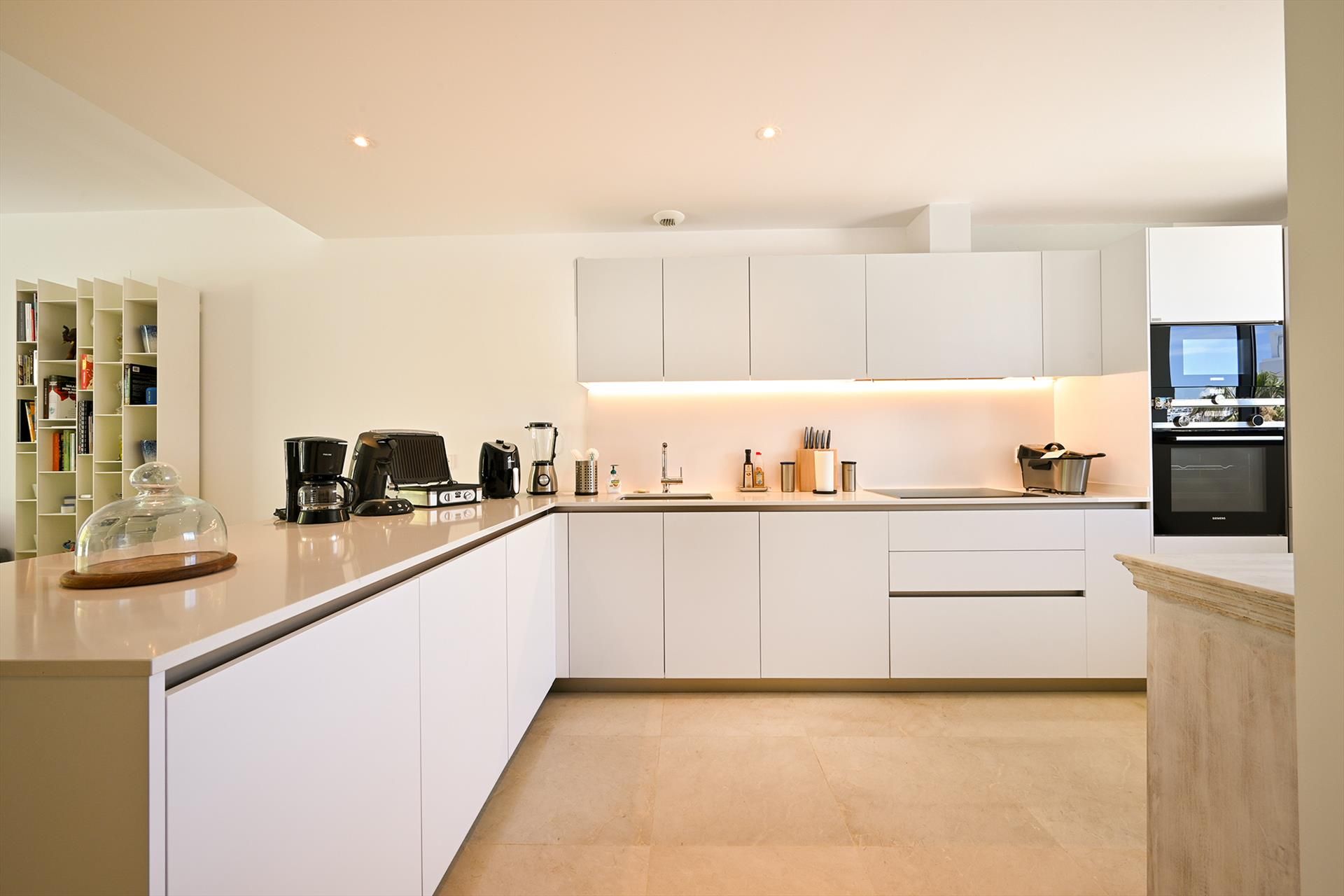 En la planta baja, el hall de entrada con aseo de invitados conduce al amplio salón / comedor con una moderna cocina americana totalmente equipada con barra americana. Puertas correderas de cristal conducen a la terraza privada. El elegante salón tiene una gran Smart TV con canales españoles e internacionales y muchos canales de deportes.