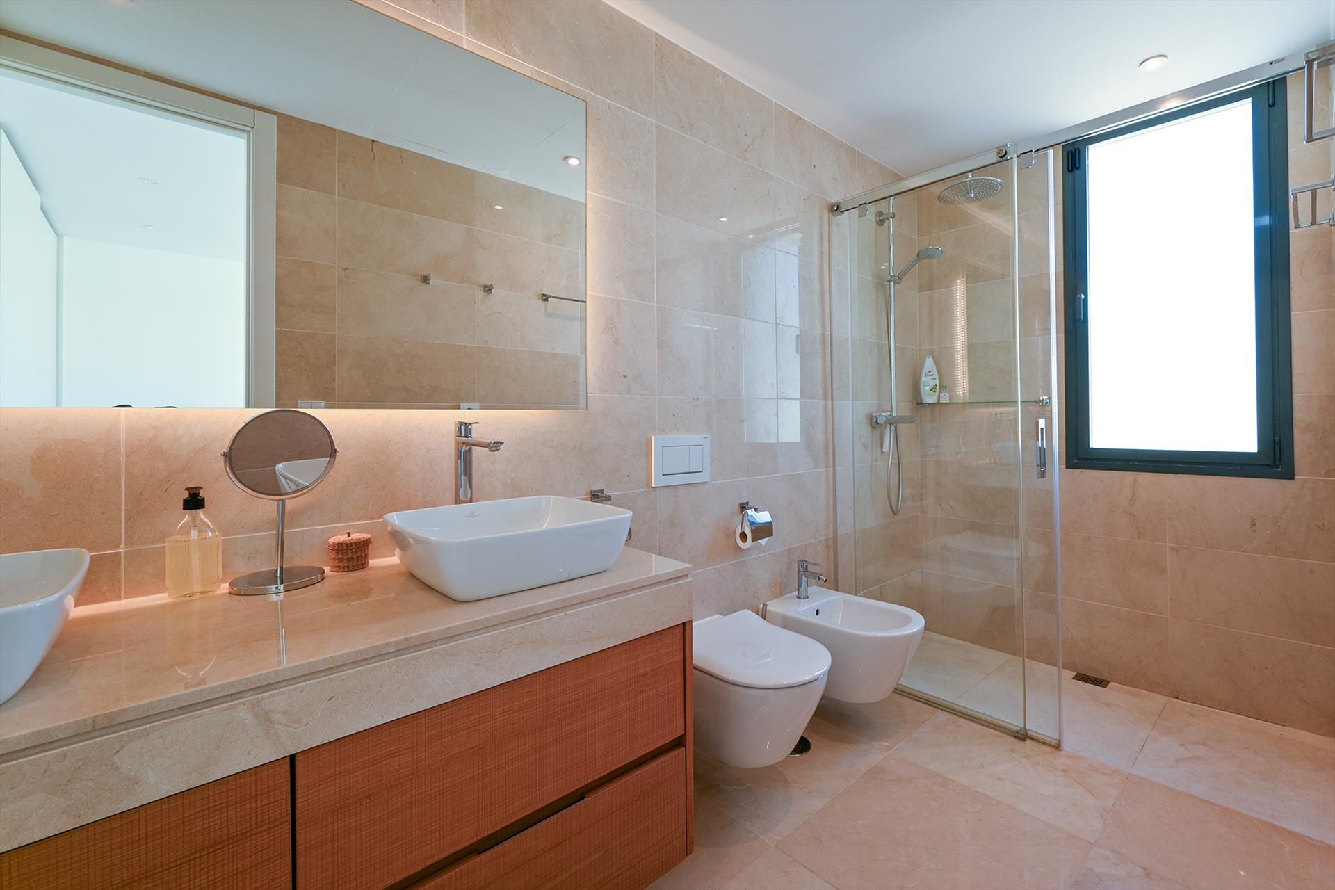 • el baño en-suite tiene un lavabo doble, una ducha a ras de suelo, bidé, inodoro y secador de pelo