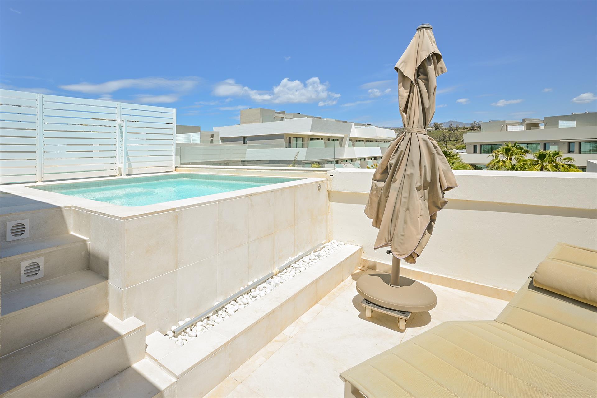 En la segunda planta se encuentra la azotea privada con vistas parciales al mar. Aquí encontrará una pequeña piscina privada, una lujosa cocina exterior con barbacoa, un comedor para 6 personas y dos tumbonas.