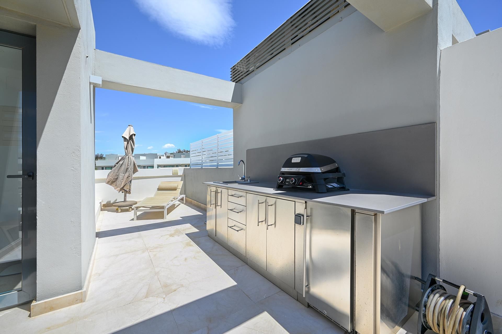 • En la segunda planta se encuentra la azotea privada con piscina privada y vistas parciales al mar. También hay una cocina de lujo al aire libre con nevera y barbacoa eléctrica Weber. La terraza de la azotea también tiene una gran mesa de comedor con 6 sillas. Aquí podrá relajarse en la piscina, tomar el sol en las tumbonas y terminar el día con una barbacoa culinaria y una bebida refrescante.