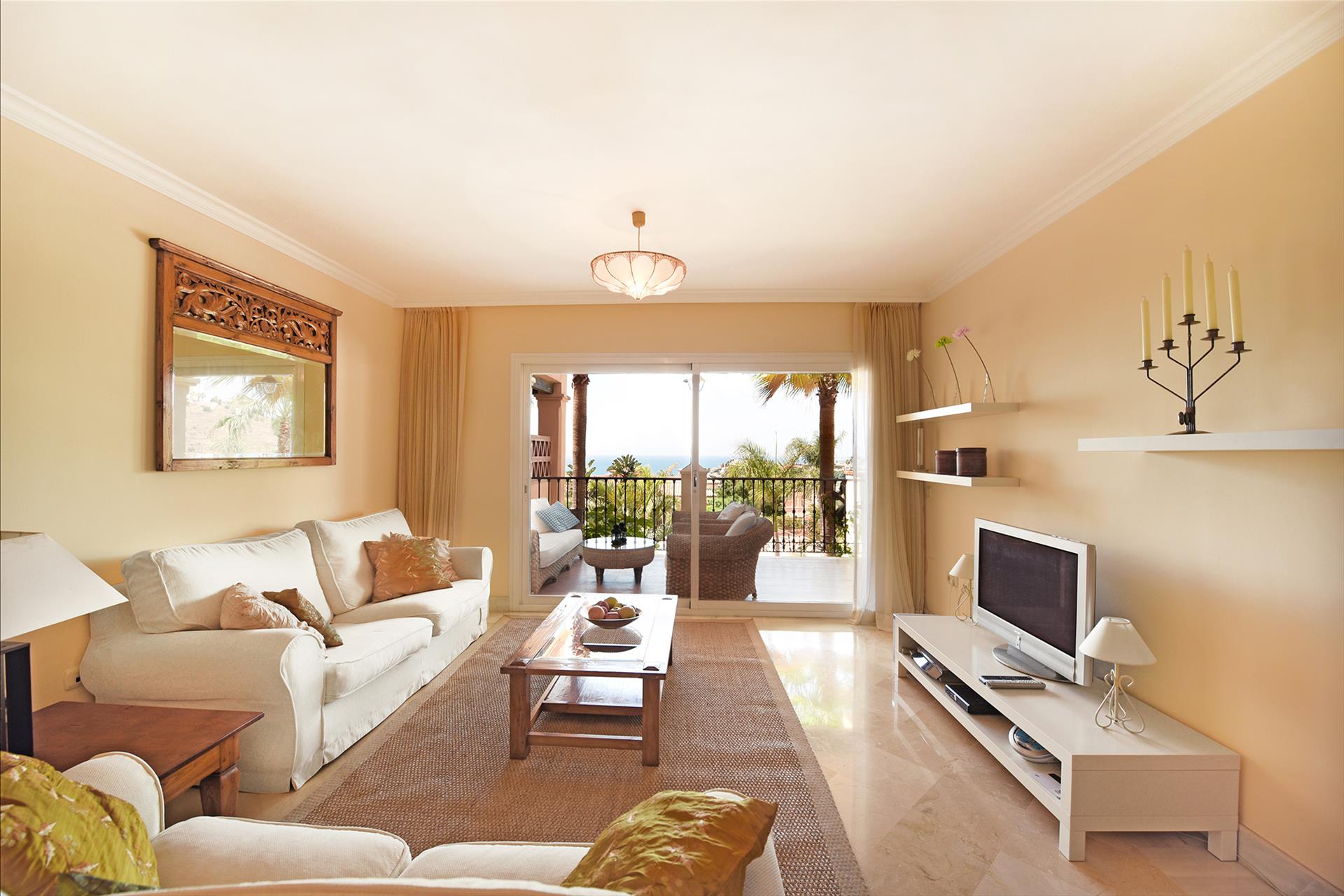 Diese Ferienwohnung mit zwei Schlafzimmern und zwei Bädern liegt in die schöne Anlage Mediterra mit Schwimmbad und wunderschöner Aussicht auf das Meer und die Küste. Es gibt ein paar Stufen zur Wohnung. Die Wohnung ist komfortabel eingerichtet mit zwei Sofas, Esstisch mit 4 Stühlen und Flachbild-TV mit einigen deutschen Sendern. Kostenlose Wlan Internet. Es gibt zentrale Klimaanlage / Heizung in allen Räumen und einer großen Terrasse mit Panoramablick. Auf der Terrasse finden Sie einen Esstisch mit vier Stühlen, um Ihr Frühstück unter der spanische Sonne zu genießen, und ein Sofa mit zwei Seeseln. Vom Wohnzimmer und Terrasse aus genießen Sie einen fantastischen Blick über den subtropischen Gärten und Swimmingpool bis zum Mittelmeer.