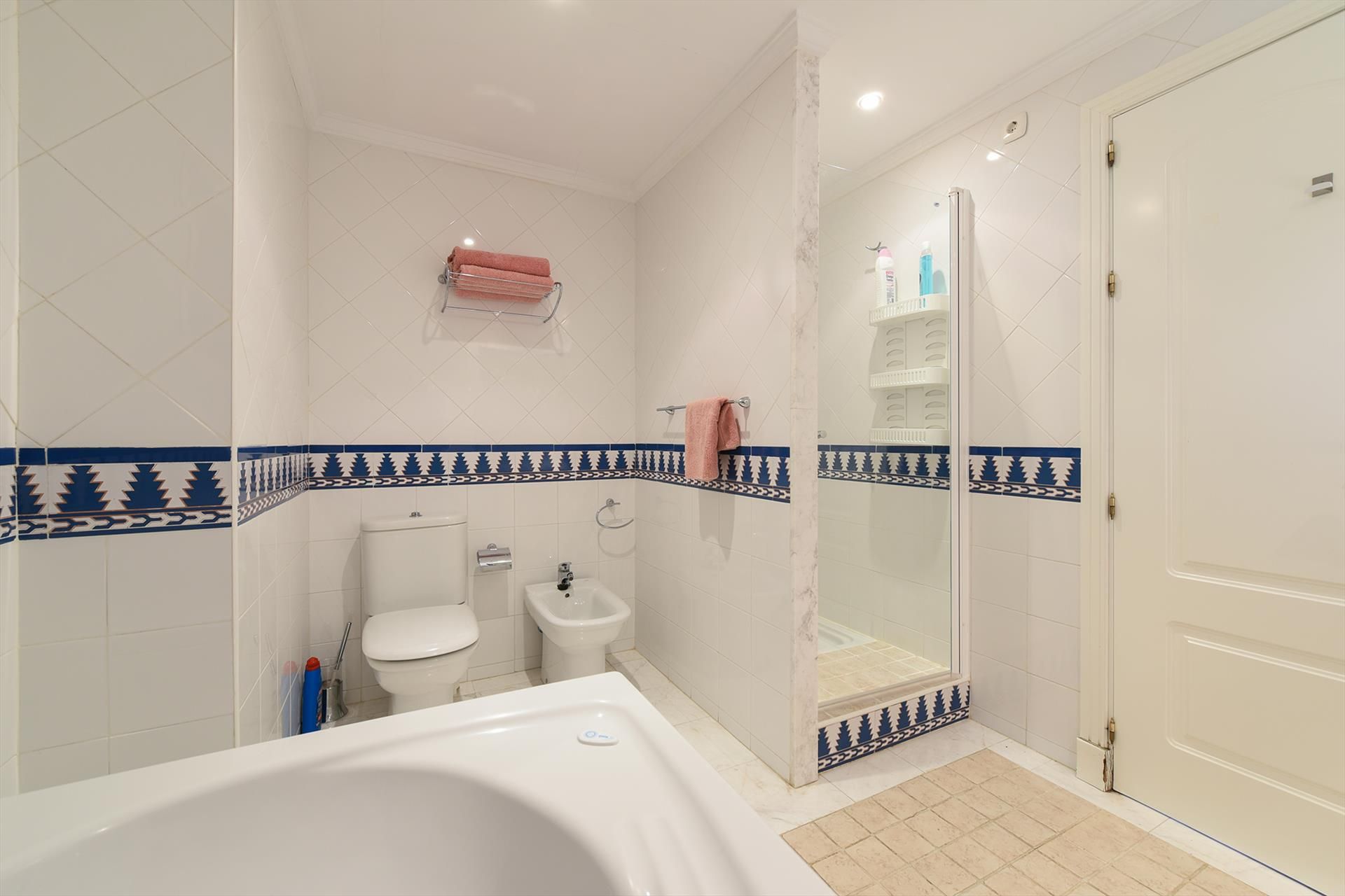 Zwei Badezimmern. Das Hauptbadezimmer hat eine Badewanne und eine separate Duschkabine, ein Badmöbel mit Doppelwaschbecken, eine Toilette, ein Bidet und ein Haartrockner. Das zweite Badezimmer verfügt über eine Dusche, ein Waschbecken und eine Toilette.