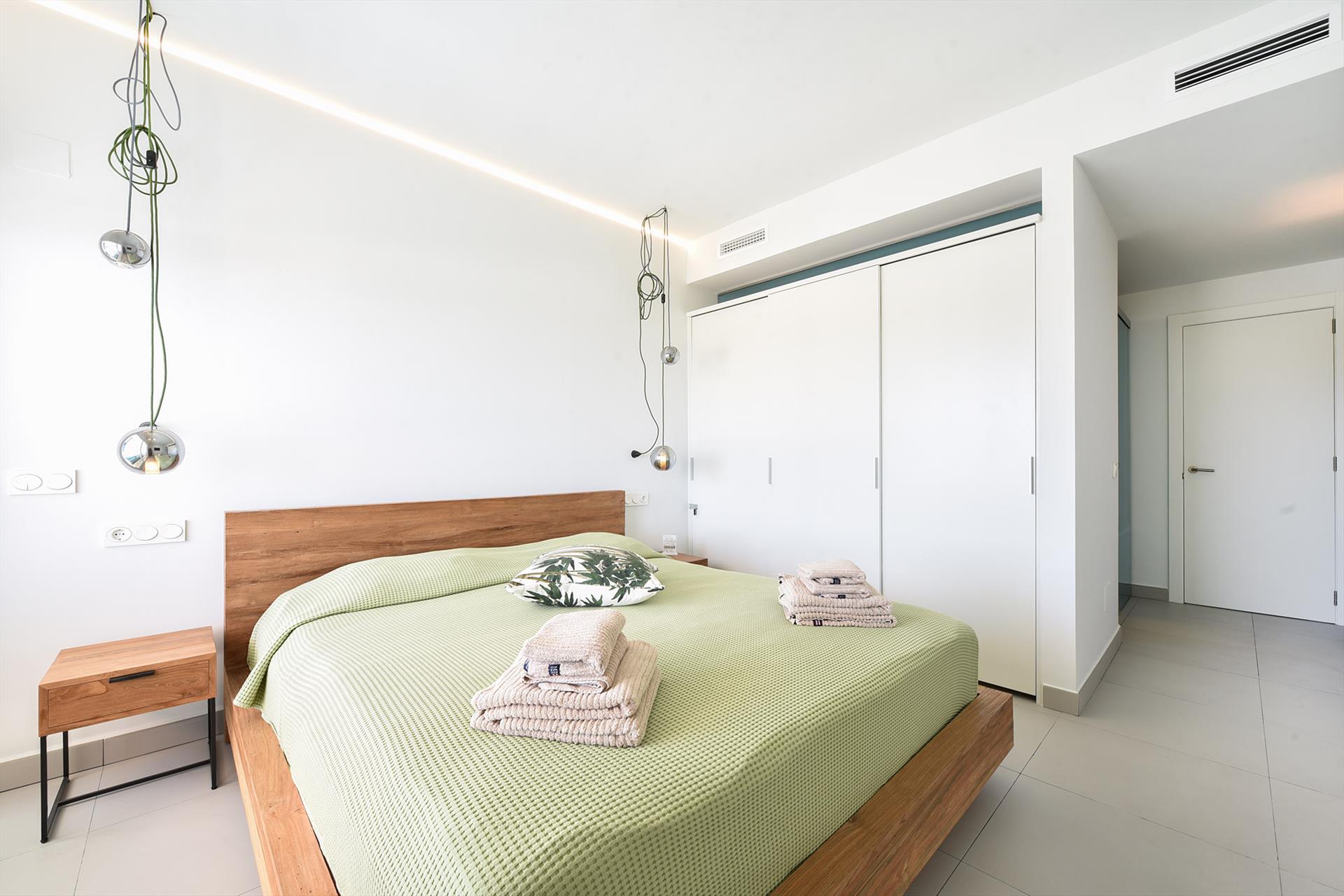 Es gibt drei Schlafzimmer, alle mit viel Schrankraum und Klimaanlage / Heizung. Das Hauptschlafzimmer hat ein Doppelbett von 180 x 200, ein En-suite badezimmer, ein Fernseher und Schiebetüren zur Terrasse. Das zweite Schlafzimmer verfügt über ein Doppelbett von 180 x 200 und ein En-suite badezimmer und ein Fernseher. Das dritte Schlafzimmer hat 2 Einzelbetten von 90 x 200, die zusammengesetzt werden können und ein eigenes Badezimmer. Ein Hochstuhl und ein Kinderbett sind auf Anfrage erhältlich.