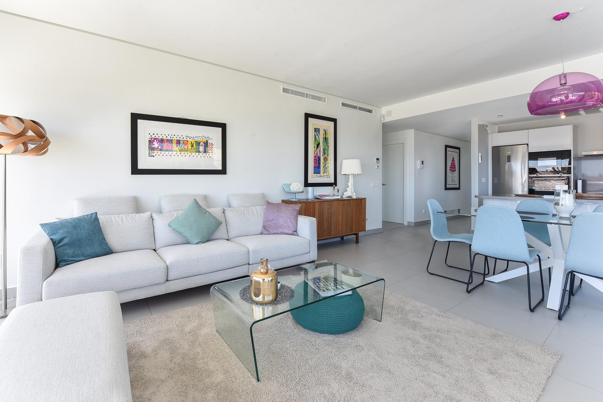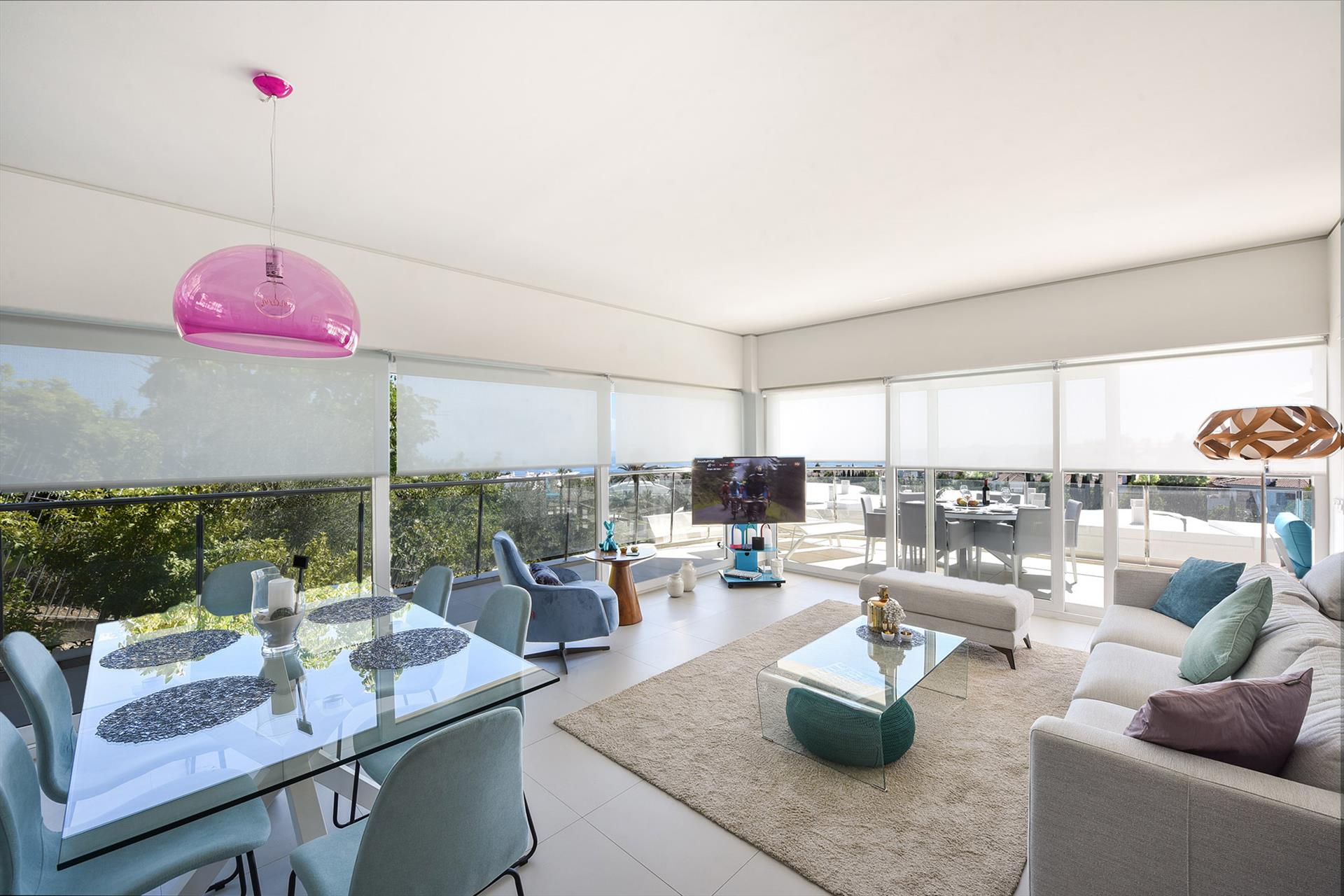 Die moderne Wohnung wurde entworfen, um den bestmöglichen mediterranen Lebensstil zu schaffen, und ist in einem modernen und luxuriösen Stil gebaut. Sie besteht aus 3 Schlafzimmern und 3 Badezimmern und ist geschmackvoll nach den neuesten Trends eingerichtet. Sie verfügt über eine Klimaanlage (warm/kalt), eine voll ausgestattete Küche, kostenloses WLAN über Glasfaser und einen Flachbildfernseher mit deutschen Sendern über IPTV. Die geräumige, nach Süden ausgerichtete Terrasse mit luxuriösen Terrassenmöbeln und 2 Sonnenliegen bietet einen atemberaubenden Blick auf die Küste. In der Tiefgarage stehen 2 Parkplätze zur Verfügung. Es gibt einen Aufzug von der Garage in die Wohnung.