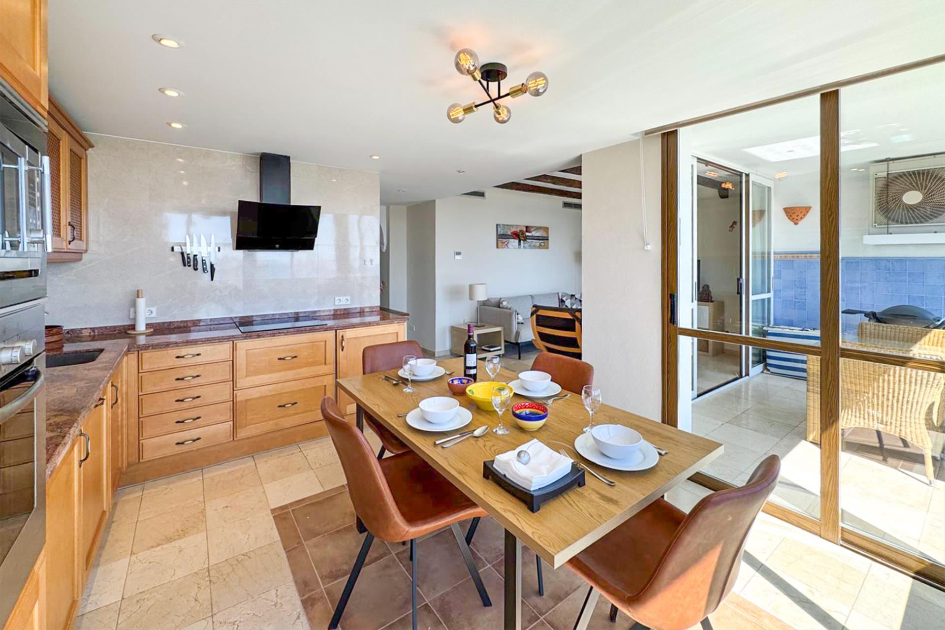 Das Wohnzimmer mit offener Küche ist dekoriert in einem gemütlichen rustikalen Stil mit Holzbalkendecken. Von der Sitzecke und Theke in der Küche können Sie den herrlichen Blick auf das Mittelmeer und die Umgebung genießen. Das Wohnzimmer und die Küche führt auf die Terrasse mit Blick auf den Garten mit Pool und Meerblick.