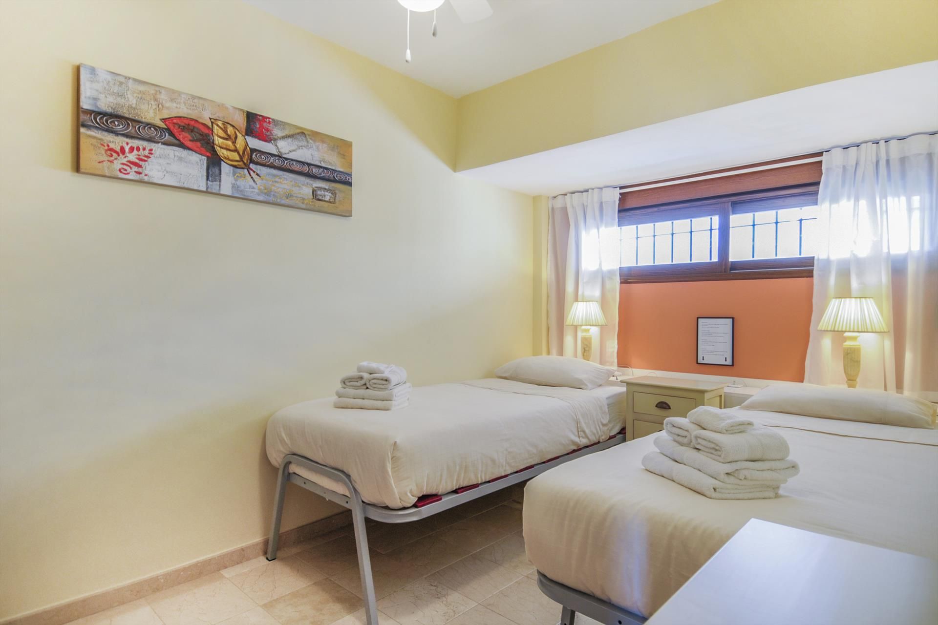 Zwei Schlafzimmern mit ausreichend kleiderschränke. Das Hauptschlafzimmer verfügt über 2 Betten zusammengestellt von 90 x 200, En-suite Badezimmer und Klimaanlage/Heizung. Das zweite Schlafzimmer hat 2 Einzelbetten von 90 x 200 und Klimaanlage / Heizung. Ein Kinder-Hochstuhl und Kinderbett sind auf Anfrage verfügbar.