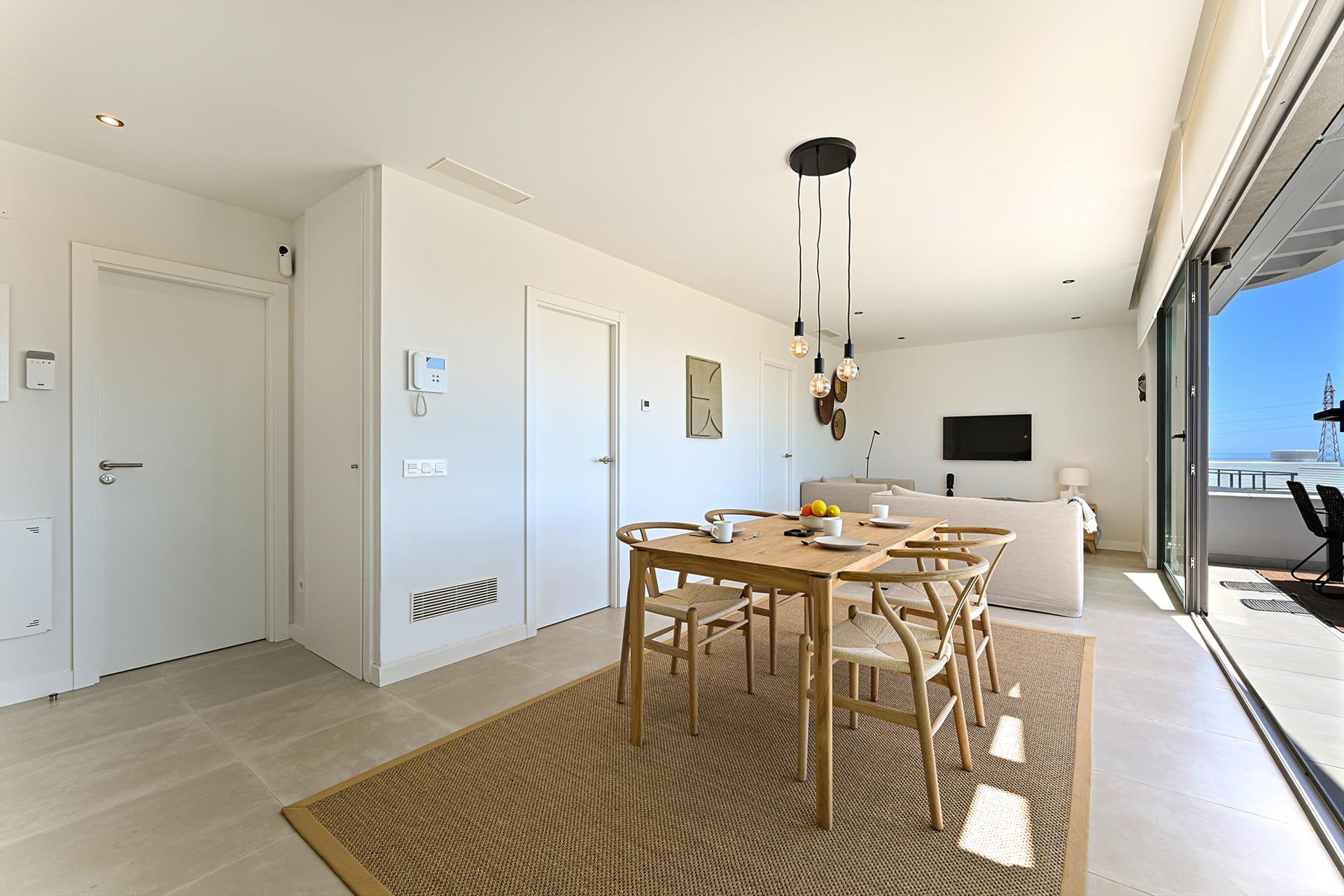 Diese luxuriöse Ferienwohnung verfügt über ein sonniges Wohnzimmer, das zu einer großen Süd-West-Terrasse mit Meerblick führt, eine voll ausgestattete moderne offene Küche, 2 Schlafzimmer und 2 Badezimmer. Die Wohnung ist mit modernen und bequemen Möbeln eingerichtet. Die Wohnung befindet sich im dritten Stock und verfügt über einen Aufzug. Sie haben zwei private Parkplätze in der Tiefgarage mit Aufzug Zugang zur Wohnung.