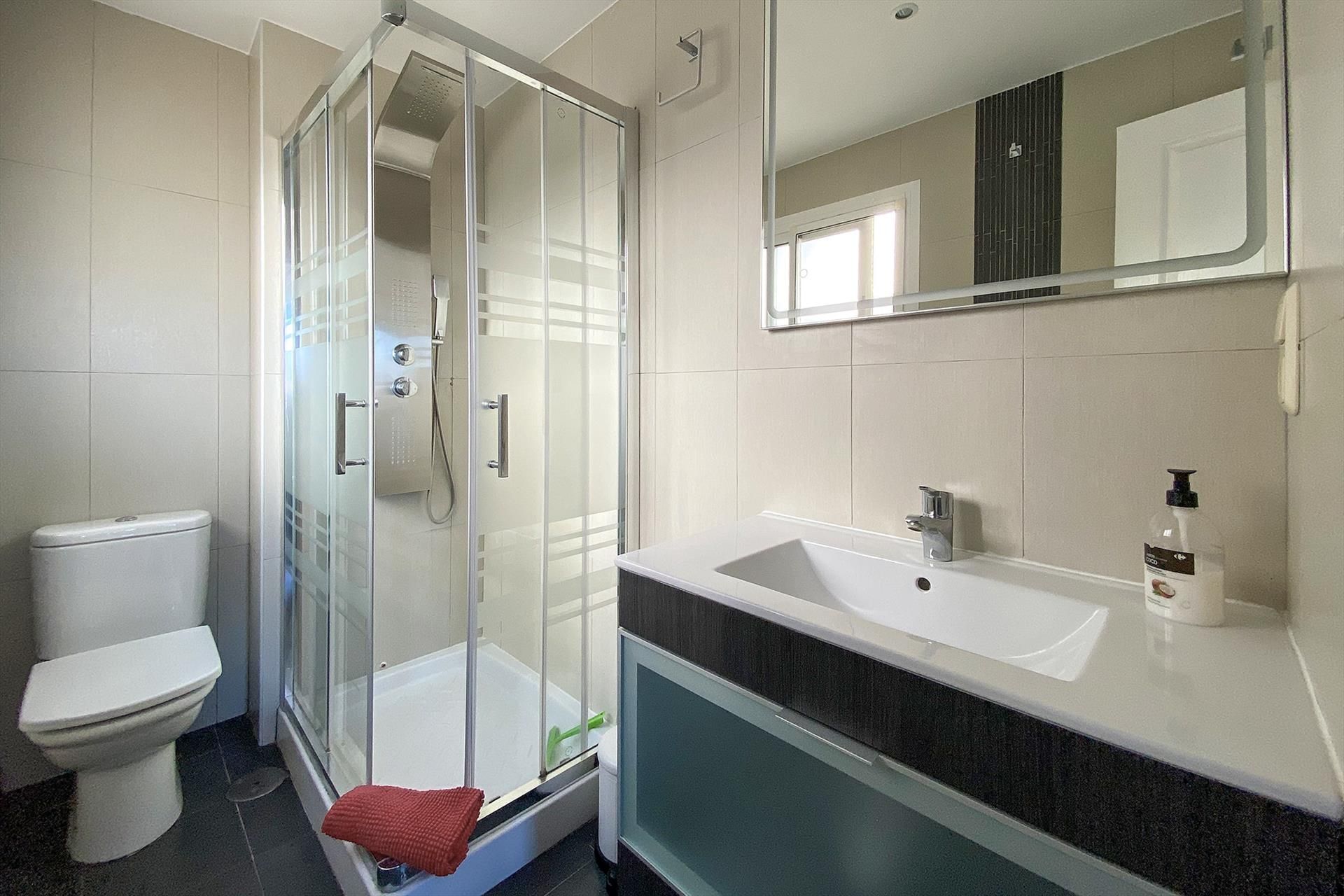 - Es gibt zwei Bäder. Die en-suite Badezimmer hat eine Dusche, eine Toilette, ein Waschbecken und einen Schrank. Es gibt einen Haartrockner.