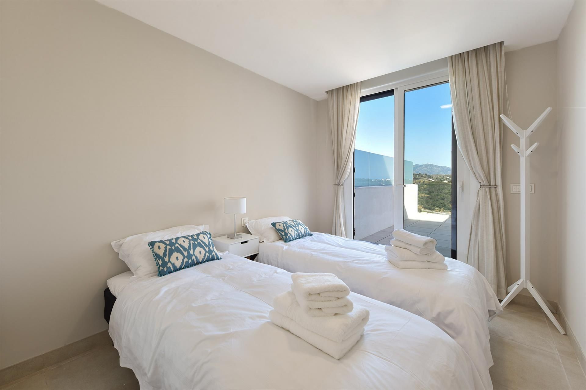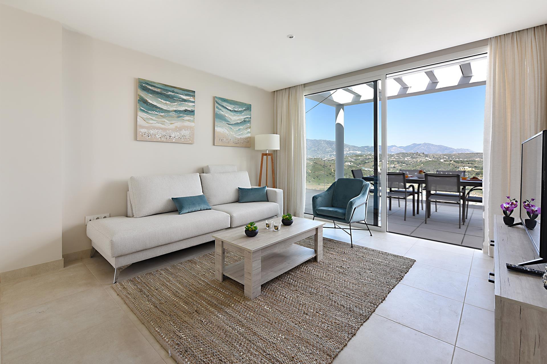 Die Wohnung ist modern eingerichtet und mit allen Annehmlichkeiten ausgestattet. Es gibt 3 Schlafzimmer, 2 Badezimmer und eine moderne offene Küche mit allen notwendigen Geräten. Die Wohnung hat 2 Terrassen, 1 im Nordosten und 1 im Südwesten, so dass es immer einen Platz in der Sonne oder nur im Schatten gibt. Die Terrasse in der neben der Wohnzimmers bietet Aussicht auf das Tal und die Berge von Mijas, und die Terrasse inebn der Küche bietet Blick aufs Meer.
