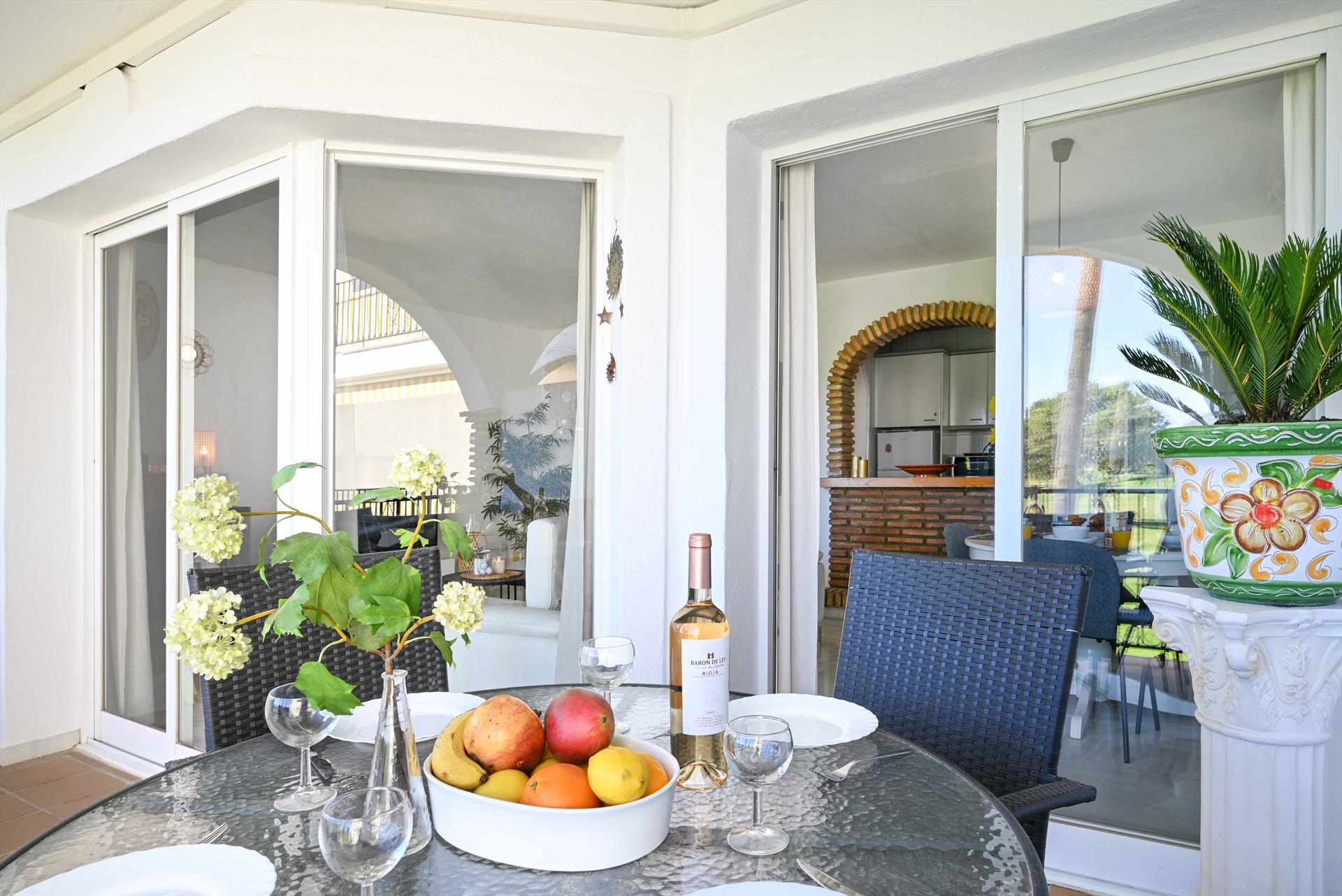 Vom Wohnzimmer aus gelangen Sie auf die herrliche überdachte, nach Osten ausgerichtete Terrasse mit direktem Blick auf den Pool und den Mijas Golfplatz. Auf der Terrasse können Sie ein köstliches Frühstück oder Abendessen am Esstisch mit 4 Stühlen genießen. Hinter dem Hauptschlafzimmer befindet sich eine kleine zusätzliche Terrasse auf der Straßenseite, auf der Sie einen Morgenkaffee genießen können. Hier stehen 2 Klappstühle, die am Poolbereich genutzt werden können, solange sie nach Gebrauch wieder zurückgenommen werden.