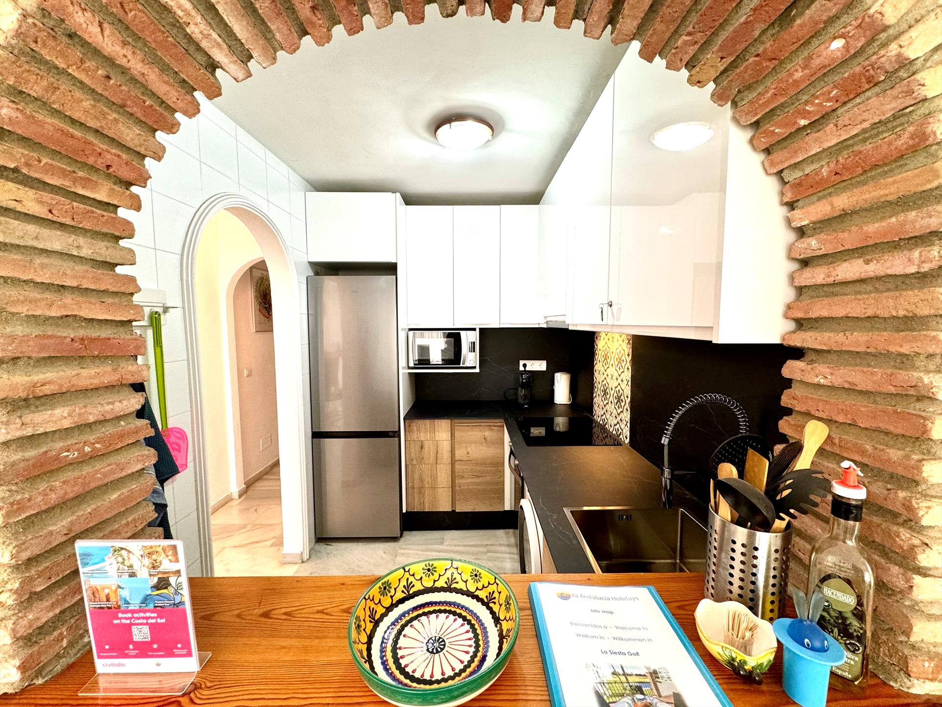 Schöne 4-Personen-Wohnung mit zwei Schlafzimmern, zwei Bädern, eine voll ausgestattete Küche und eine große Terrasse mit Blick auf den Mijas Golfplatz. Das Wohnzimmer verfügt über ein bequemes Lounge-Sofa mit Sessel, einen Essbereich für bis zu 4 Personen mit einer Durchreiche zur Küche. Die Wohnung befindet sich im zweiten Stock und verfügt über eine private Terrasse mit einem Terrassentisch mit 4 Stühlen, wo Sie ein schönes Frühstück in der Morgensonne mit herrlichem Blick auf den Pool und Mijas Golfplatz genießen können. Das Wohnzimmer ist geschmackvoll eingerichtet und verfügt über einen Smart-TV mit Deutsche und anderen internationalen Kanälen. Diese Wohnung ist die perfekte Basis für einen unbeschwerten (Golf-) Urlaub an der Costa del Sol. Schlagen Sie einen Ball auf einem der beiden 18-Loch-Golfplätze von Mijas Golf oder genießen und entspannen Sie auf der Terrasse in dieser charmanten Ferienwohnung in La Siesta de Mijas Golf.