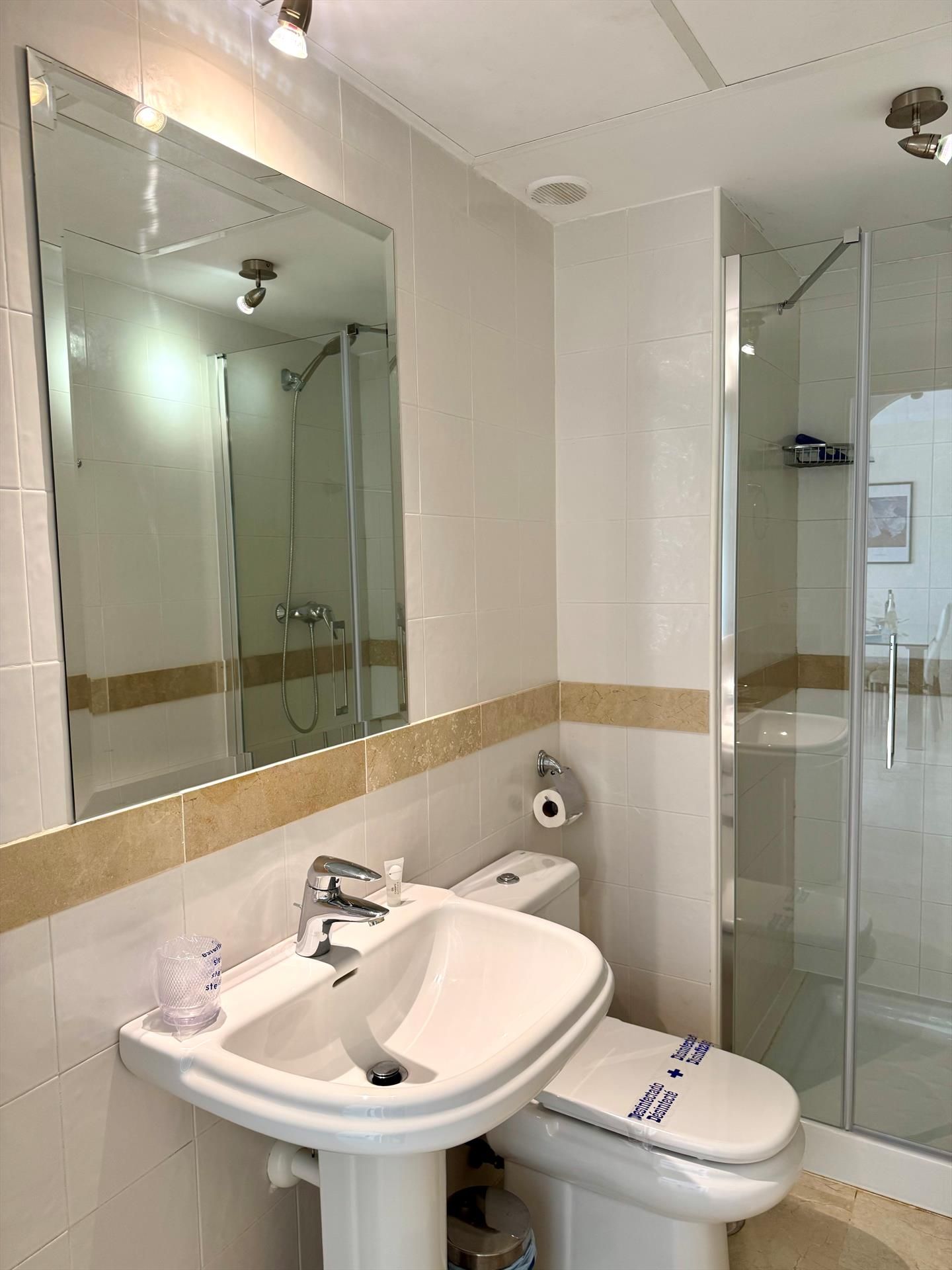 • Zweites Badezimmer mit Dusche, Waschbecken, Fön und WC.
