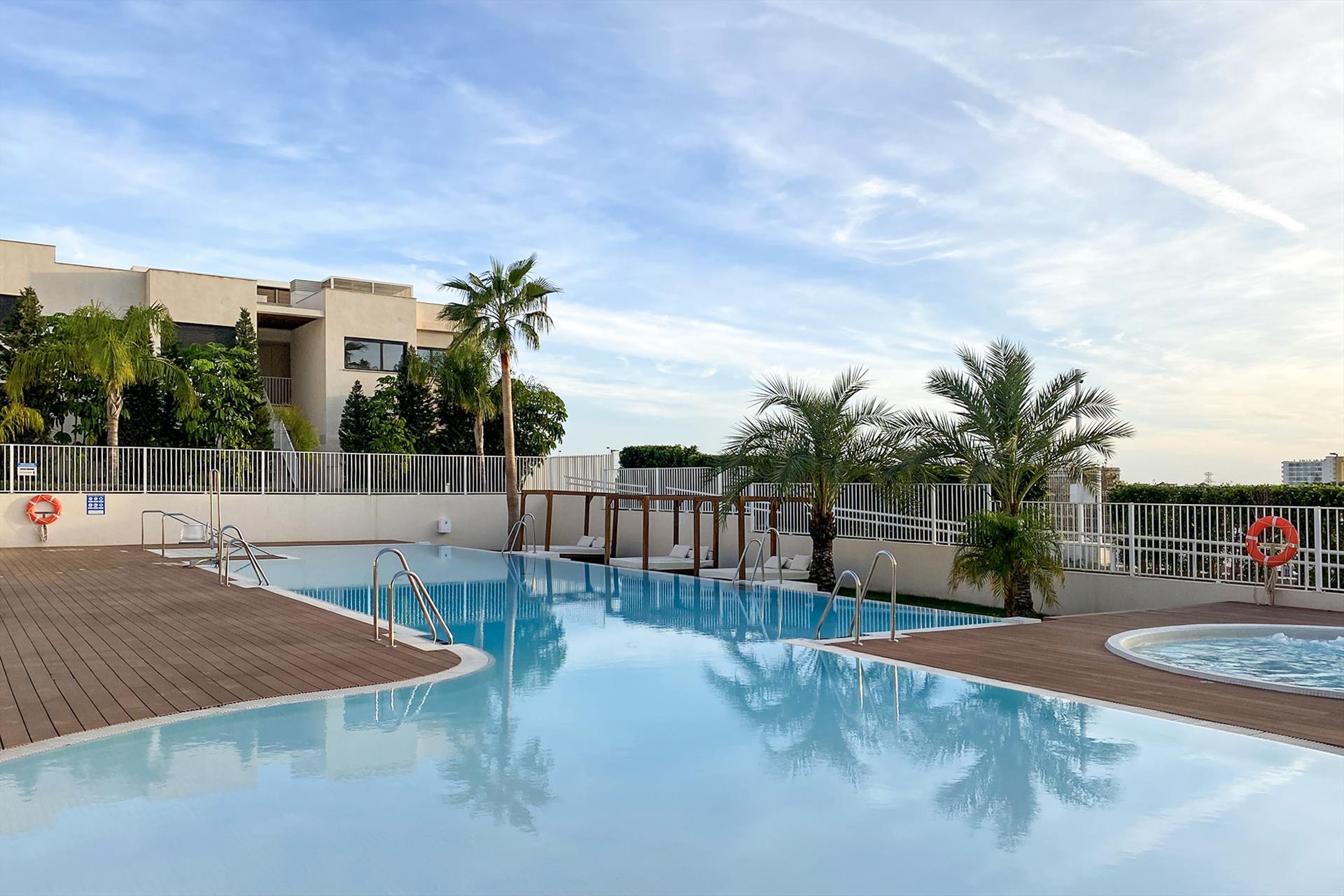 • Gemeinschaftspool umgeben von einer hölzernen Sonnenterrasse mit kostenlosen Sonnenliegen