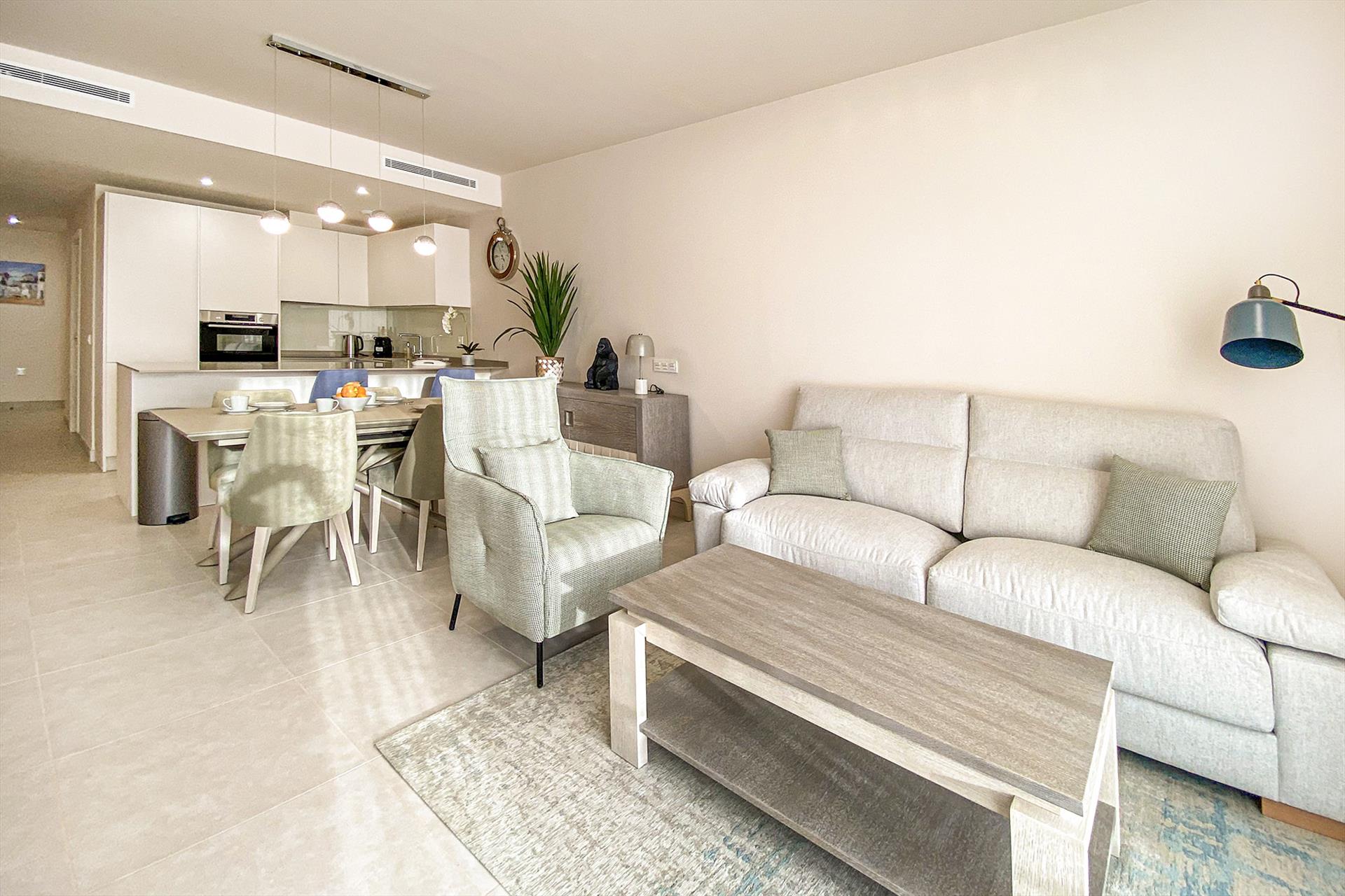 • geräumiges Wohn-/Esszimmer mit offener Küche, Klimaanlage und Schiebetüren zur Terrasse