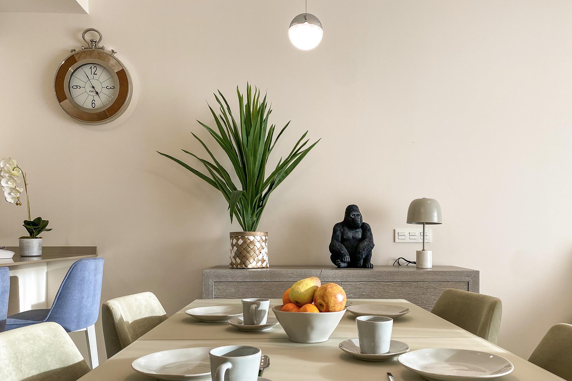 Das Wohn-/Esszimmer ist modern eingerichtet und verfügt über eine voll ausgestattete offene Küche. In der Sitzecke befindet sich ein Smart TV mit internationalen Kanälen, darunter auch deutsche Sender und viele Sportkanäle. Durch die Glasschiebetüren gelangt man auf die eigene Terrasse.