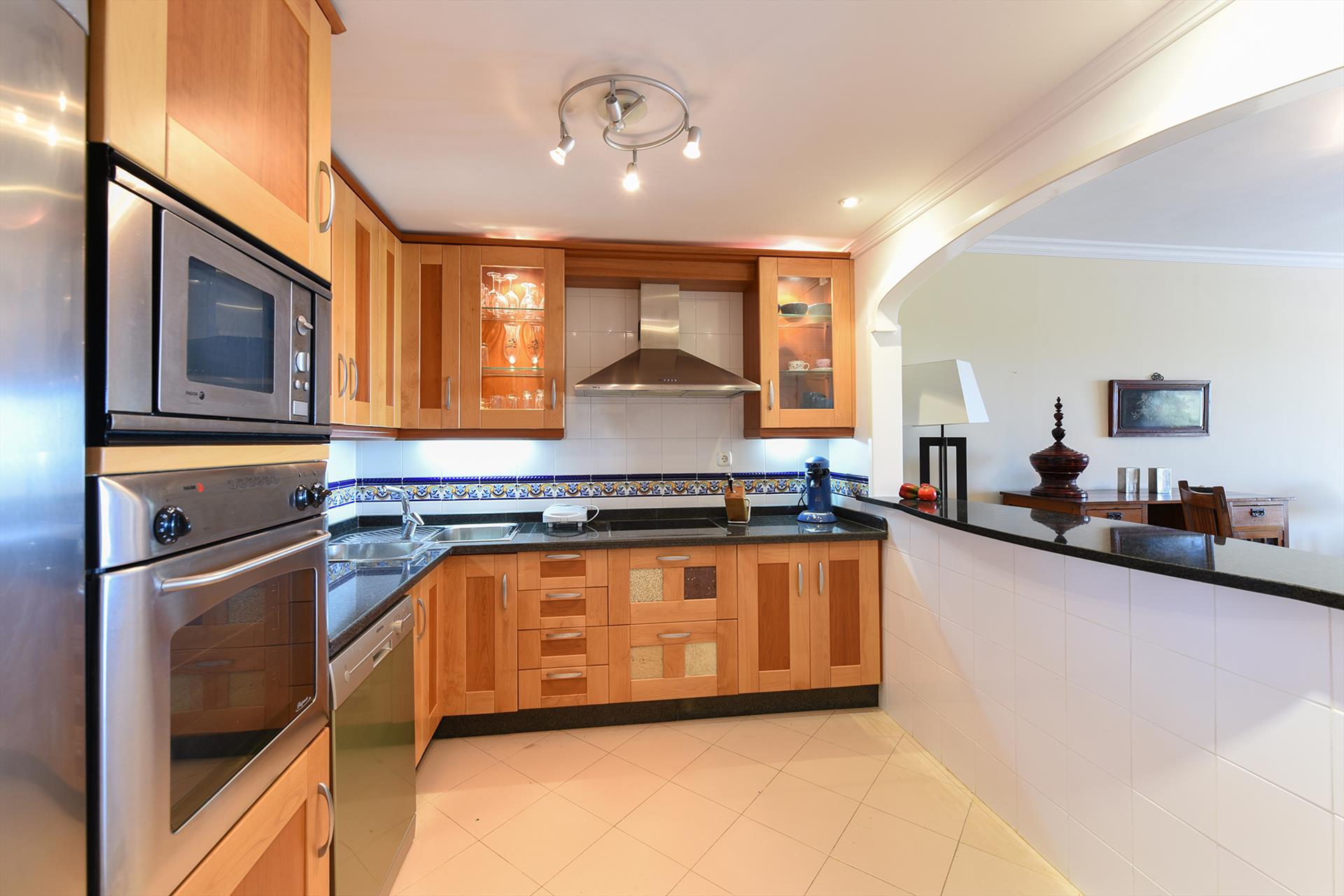 Fully equipped kitchen with ceramic hob, extractor, oven, microwave, refrigerator, dishwasher, coffee machine, water cooker, toaster and granite worktop.