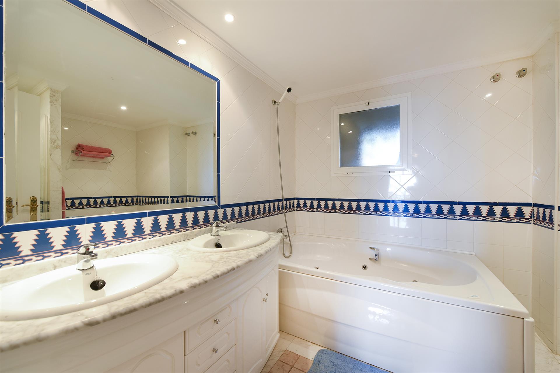Two bathrooms. The master bathroom has a bathtub and a separate shower, a bathroom cabinet with double sink, a toilet, a bidet and a hair dryer. The second bathroom has a shower, a washbasin and a toilet.