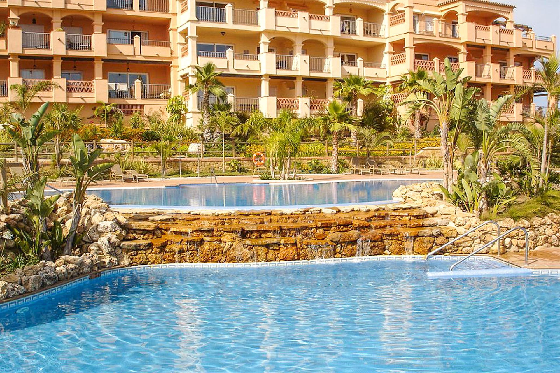 There are 3 pools and a children's pool with terraces, sun beds, shower and toilets. The pools are connected by waterfalls and fountains and are surrounded by beautiful flowers and palm trees.