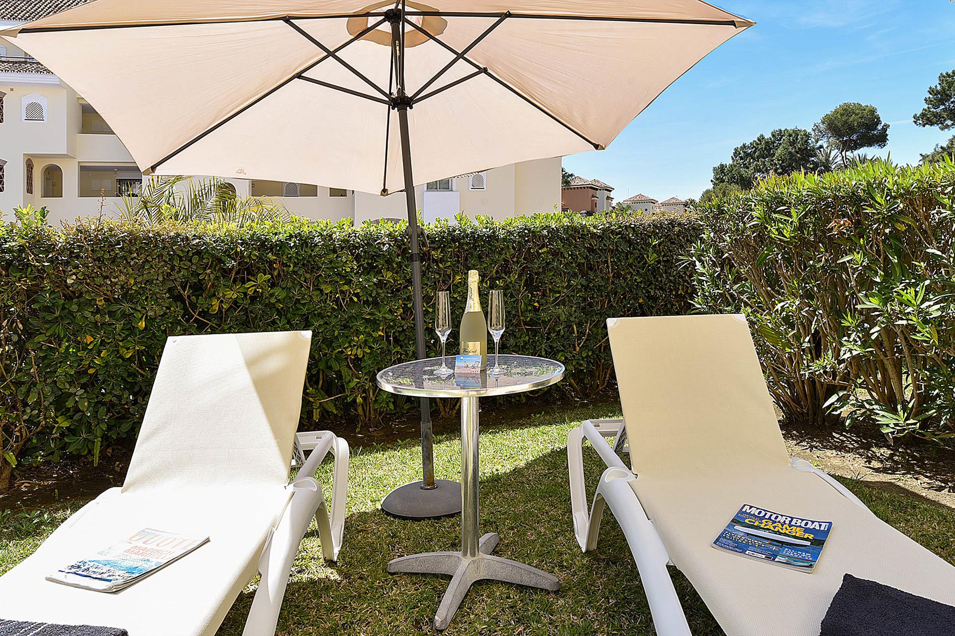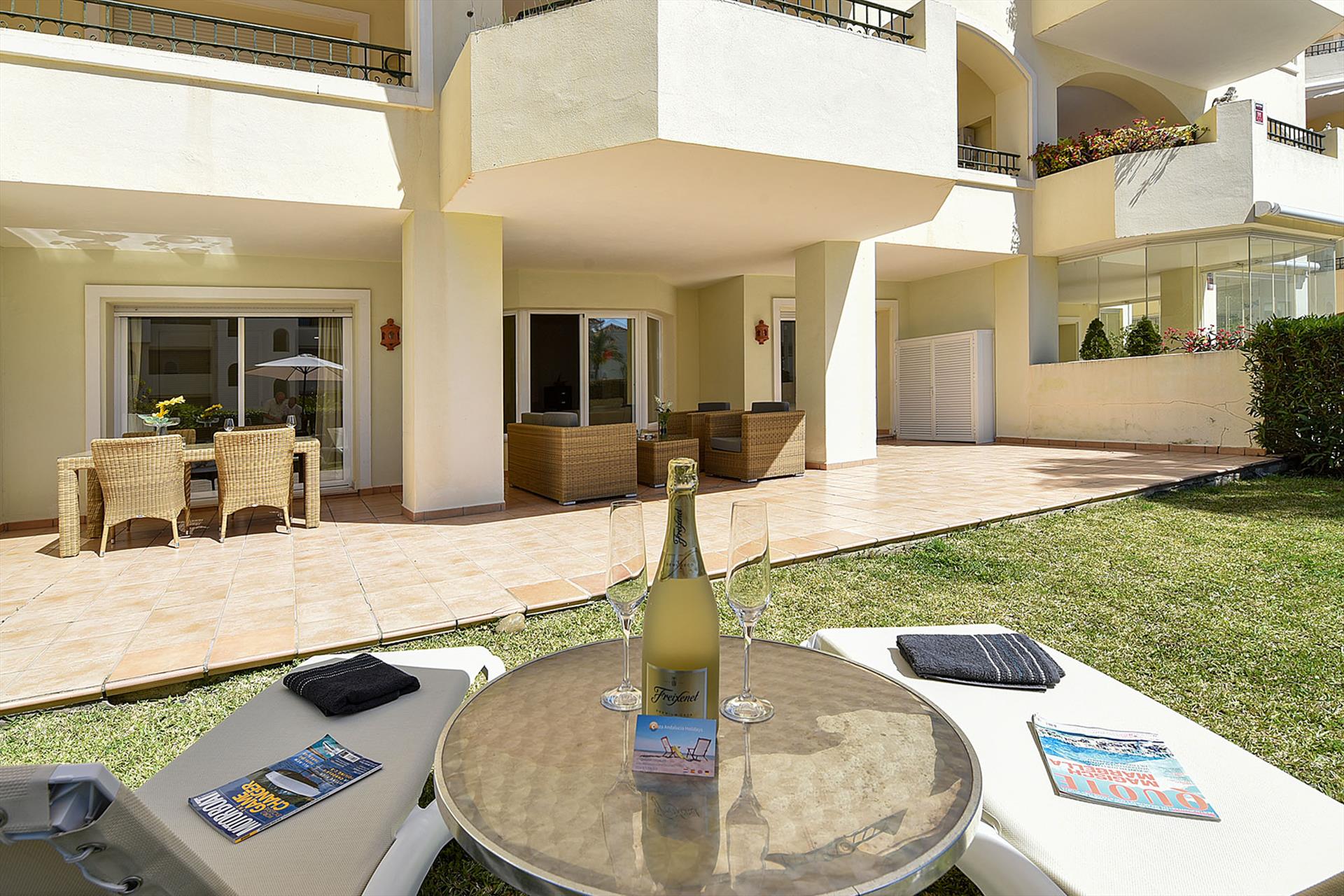 The apartment is located in the beach resort Hacienda Playa in Elviria - Marbella. Hacienda Playa is located directly on the sandy beach of Elviria on the Costa del Sol. The apartment has a spacious living room with a comfortable sofa and armchairs, a dining table with 4 chairs and sliding doors to the terrace. There are 2 spacious bedrooms with comfortable beds. Both bedrooms have en-suite bathrooms and sliding doors to the terrace. The separate kitchen is equipped with all necessary appliances. All rooms have air conditioning for cooling and heating. Free Wi-Fi via fibre optic is available. The apartment is on the ground floor and has a large, partly covered terrace of 72m2, followed by a private garden with two sun beds and plenty of sun. Even in spring, autumn and winter, you can enjoy many hours of sunshine in your own garden. From the private garden you have access to the shared subtropical garden, the swimming pool and the children's pool. On the terraces around the pool there are free-to-use sun beds.