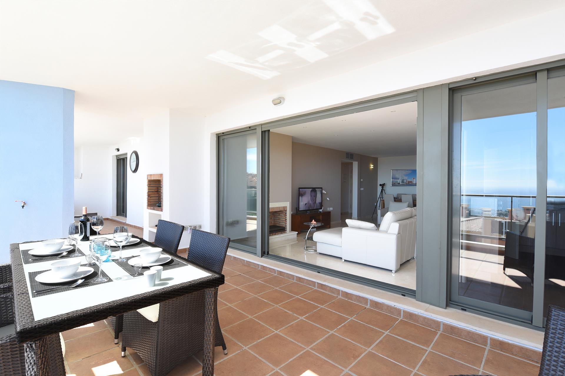 The apartment has a large covered south facing terrace with fantastic sea and coastal views. On the terrace you can enjoy your breakfast or dinner at the patio table with 6 chairs or relax on the lounge sofa with comfortable armchair.