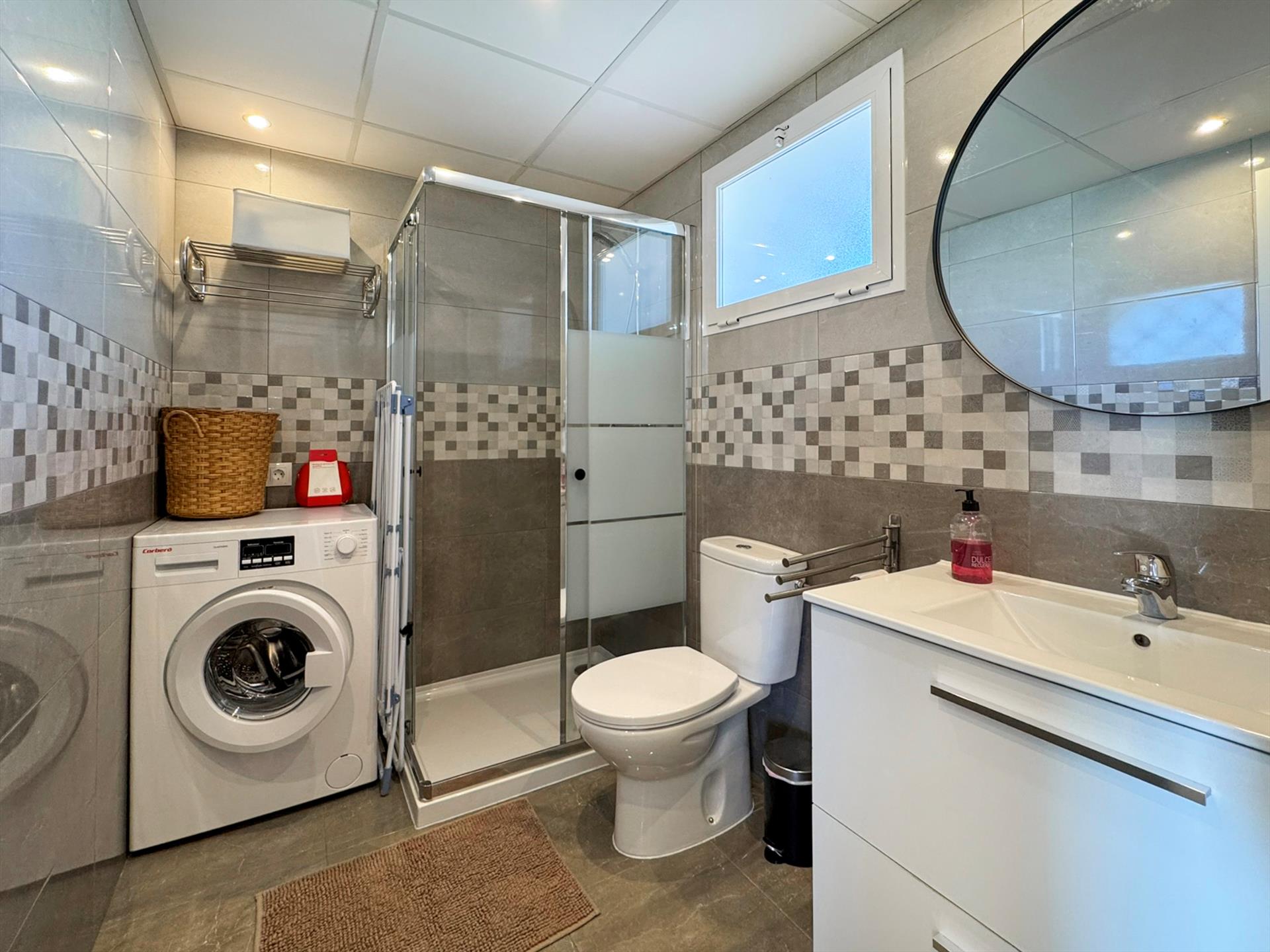 There is one bathroom with a shower, washbasin, toilet and hairdryer. The washing machine is also located in the bathroom.