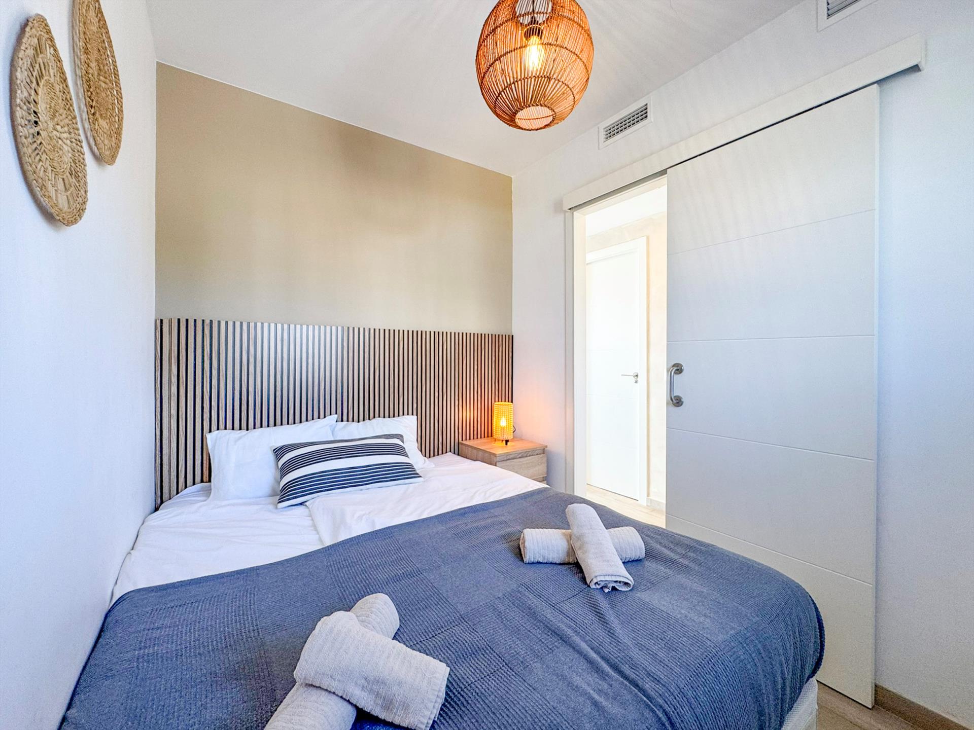 The apartment has two bedrooms. The master bedroom has a double bed measuring 160 x 200 cm, two bedside tables, a wardrobe and air conditioning with heating. The second bedroom has a smaller bed measuring 150 x 190 cm, a bedside table, a chest of drawers and air conditioning with heating. This bed is suitable for one adult or two small children. Both bedrooms have shutters for blackout. A baby cot and high chair are available on request.