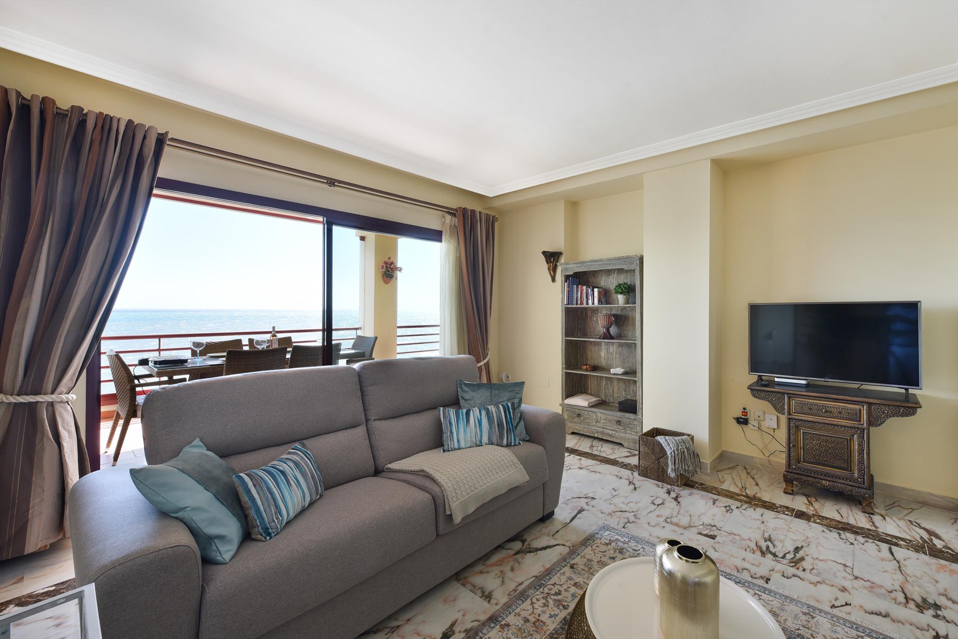Dit ruime appartement met 2 slaapkamers, 2 ruime badkamers en aparte keuken ligt op een prachtige locatie in het kleinschalige complex Puerta del Mar (Poort naar de zee). Het royale terras op het zuiden, met prachtig uitzicht op zee en de kust, is geheel afsluitbaar is met glazen schuifpanelen. Op het terras kunt u genieten van een heerlijk ontbijt of diner aan de ruime terrastafel met 6 stoelen, of heerlijk relaxen met een hapje en een drankje in een van de lounge sofa´s op het terras terwijl u geniet van het prachtige uitzicht.