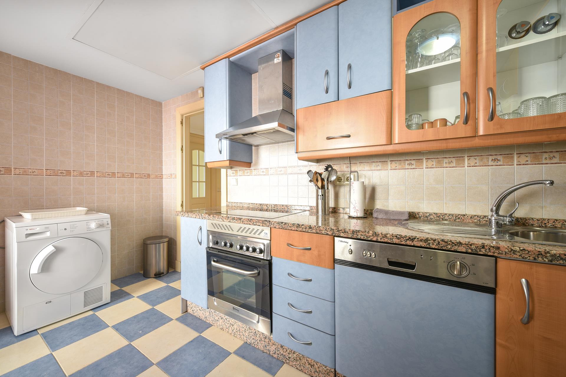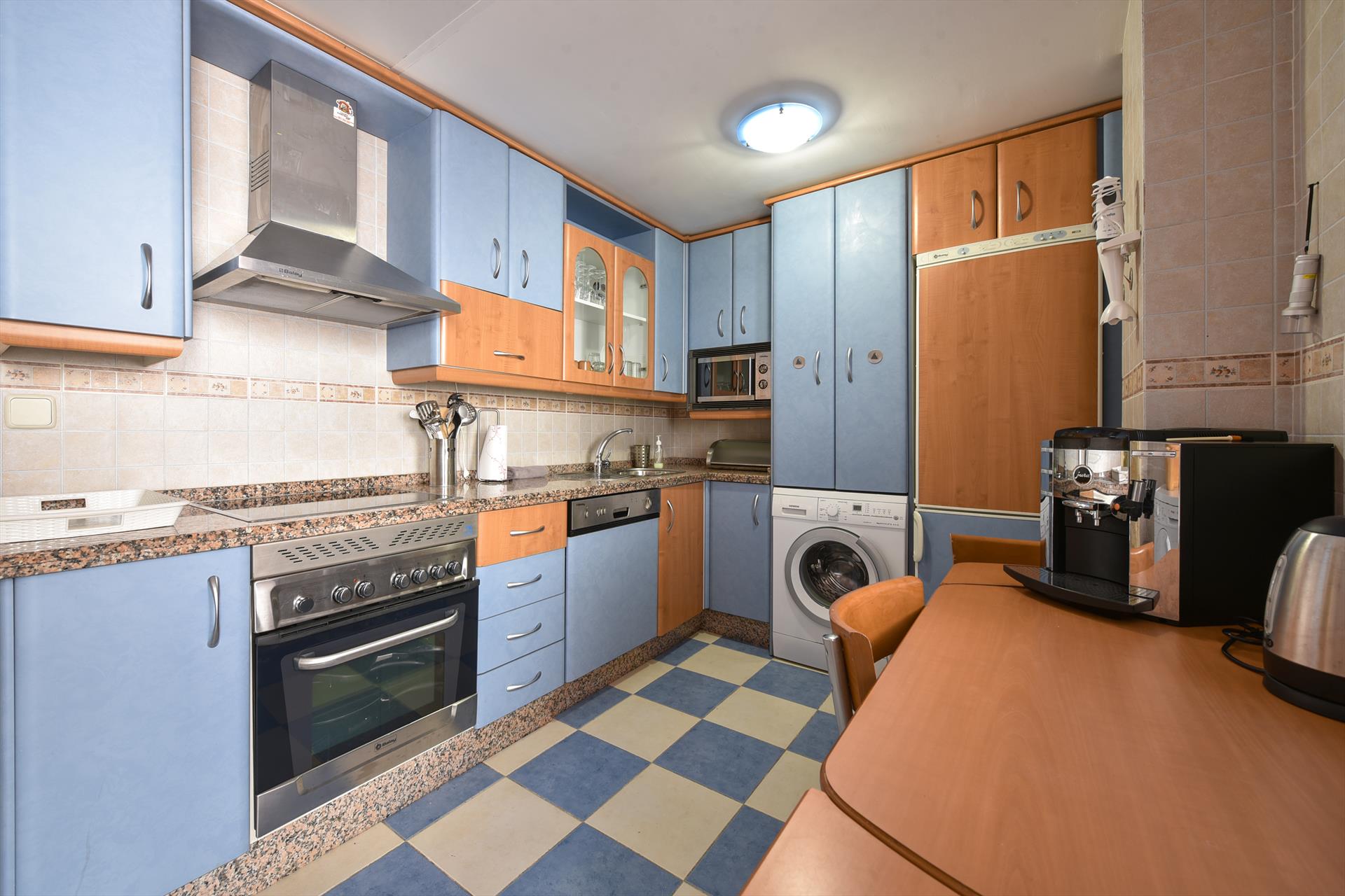 - keuken met keramische kookplaat, electrische oven, magnetron, wasmachine, wasdroger, afwasmachine, koelkast, vriezer, koffiezetapparaat, waterkoker en broodrooster