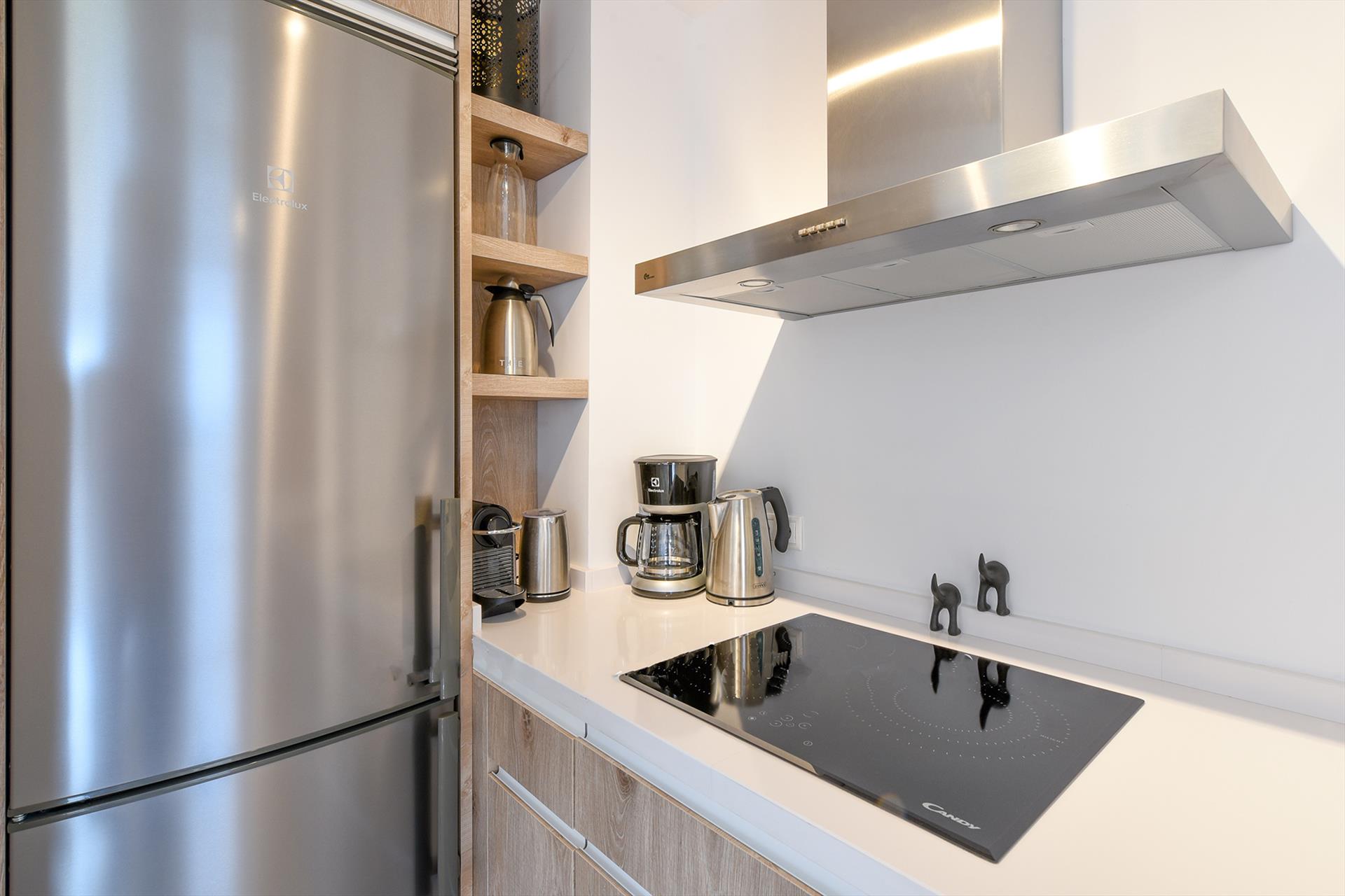 Luxe open keuken met keramische kookplaat, afzuigkap, oven, magnetron, koelkast met vrieskast, vaatwasser, koffiemachine, waterkoker, broodtoaster en silestone werkblad.