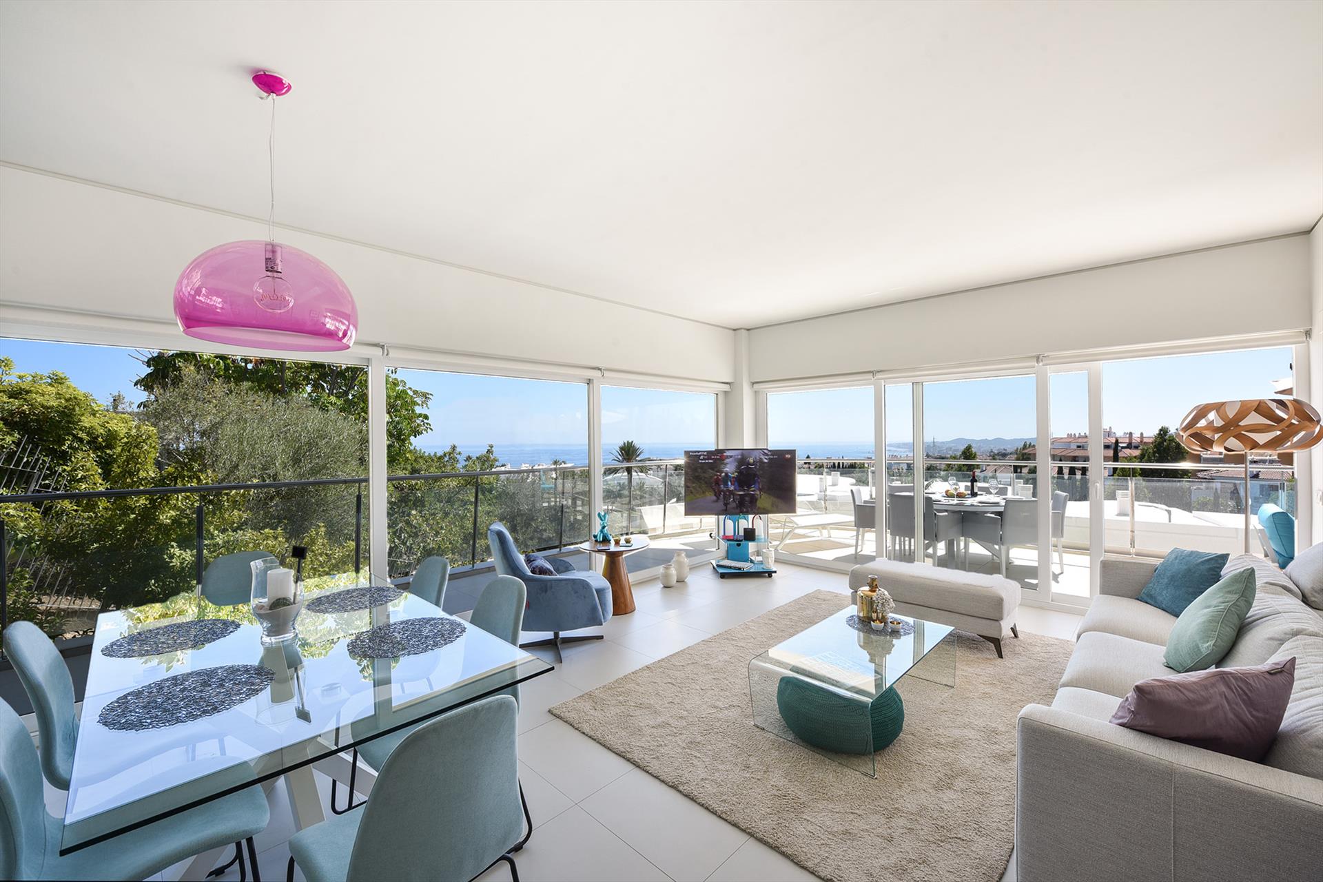 Zeer ruim, zonnig en gedeeltelijk overdekt hoekterras op het zuiden. Het ruime terras heeft een ronde eettafel met 6 stoelen, een comfortabele lounge set en 2 ligbedden. Als extra een elektrisch bedienbaar zonnescherm. Het terras bied panoramisch uitzicht over de kust en op Fuengirola.